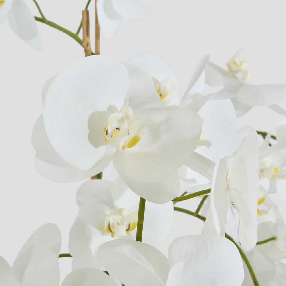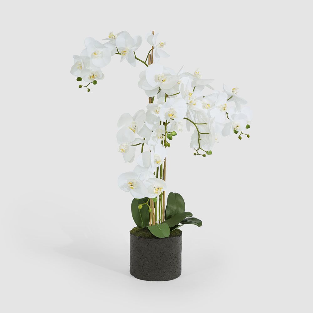 Dive into eternal springtime with our faux Medium Orchid in Paper Pot. With delicate white blooms and verdant buds swaying gracefully atop slender stems, this floral masterpiece adds a perpetual touch of elegance to your space. Nestled within a sustainable paper pot, complete with exposed roots, glossy leaves, and vibrant moss, it's a tantalizing illusion of Mother Nature's splendor, minus the upkeep.