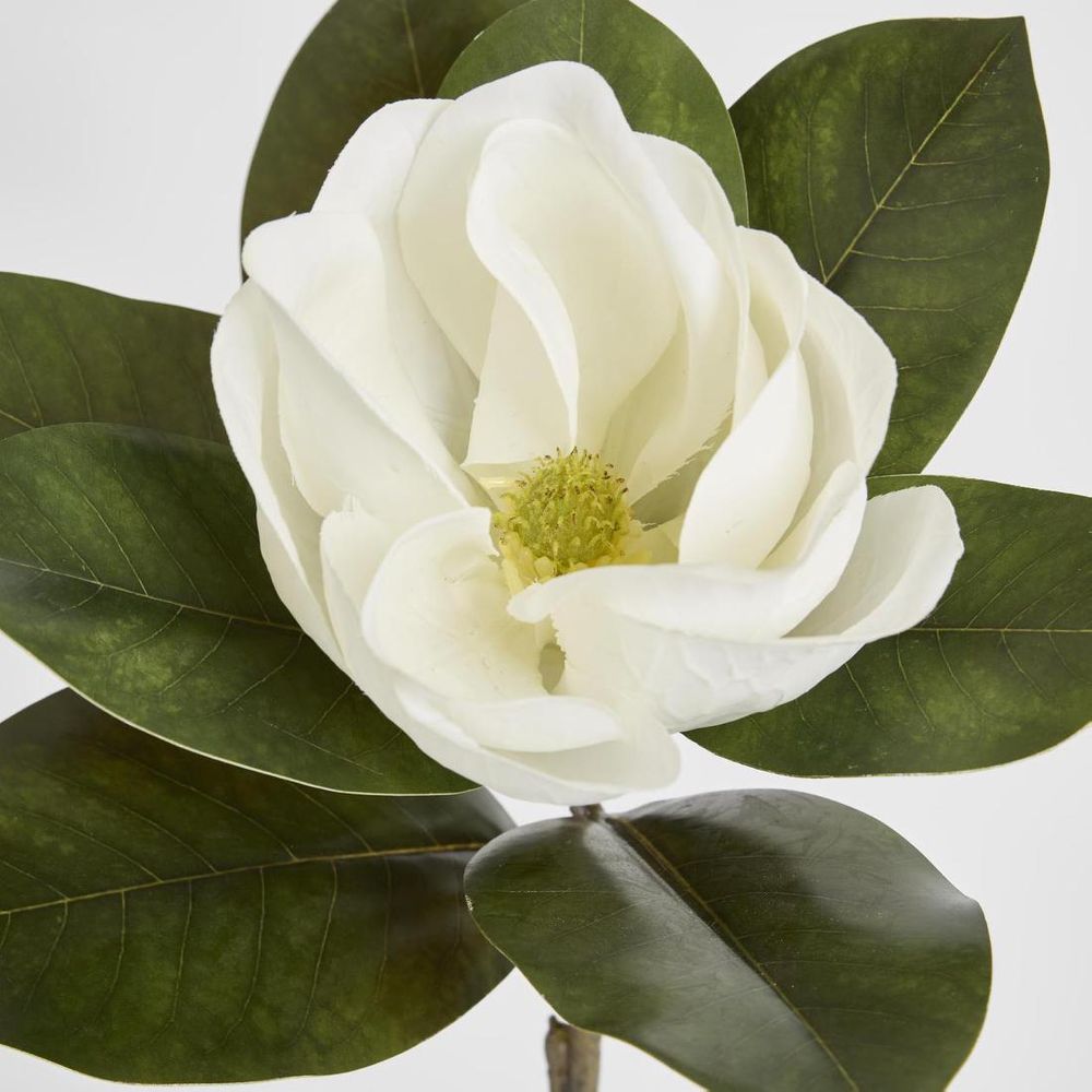 Experience the beauty of a freshly picked magnolia with our lifelike Magnolia Stem. Its large white petals, delicately folded and nestled within waxy leaves with a brown underside, create a stunning floral display. Crafted with hyperrealistic technology, this stem is long-lasting, hypoallergenic, and cost-effective. Enjoy the realistic appearance without worrying about wilting or unpleasant odors, and maintenance is a breeze with just a dusting using a static feather duster.