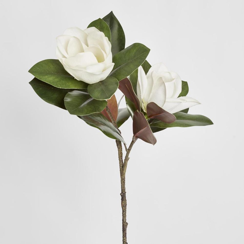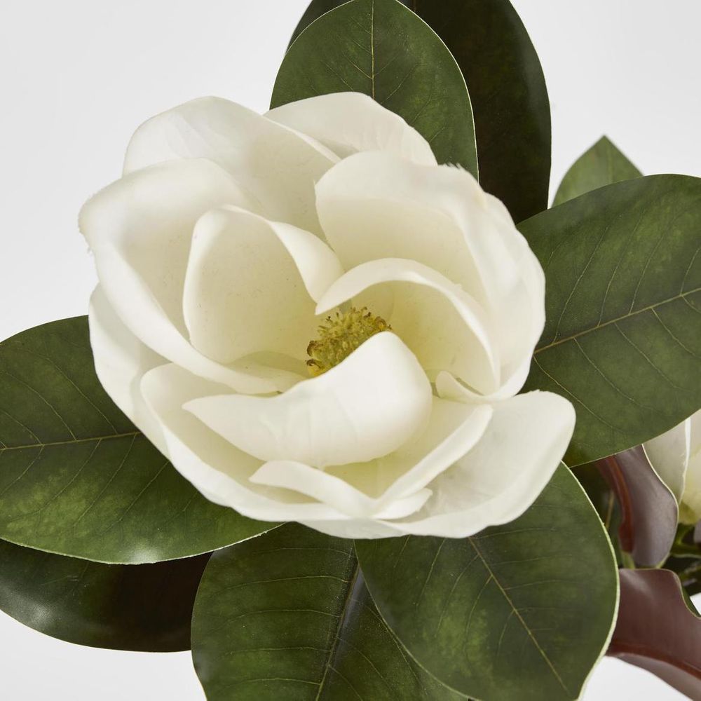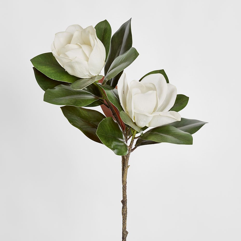Exude elegance and sophistication with our faux Large Magnolia 2 Heads. Delicate creamy-white petals unfurl into graceful cup-like shapes, perfect for enhancing bridal bouquets, centerpieces, or special event décor. Crafted with cutting-edge hyperrealistic technology, these blooms boast a stunningly lifelike appearance. Enjoy their long-lasting, hypoallergenic, and cost-effective nature, free from wilting or unpleasant odors. With no assembly required and simple maintenance, just a gentle dusting with a static feather duster keeps them pristine.