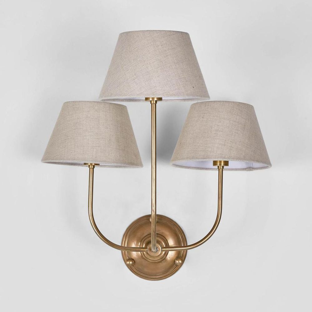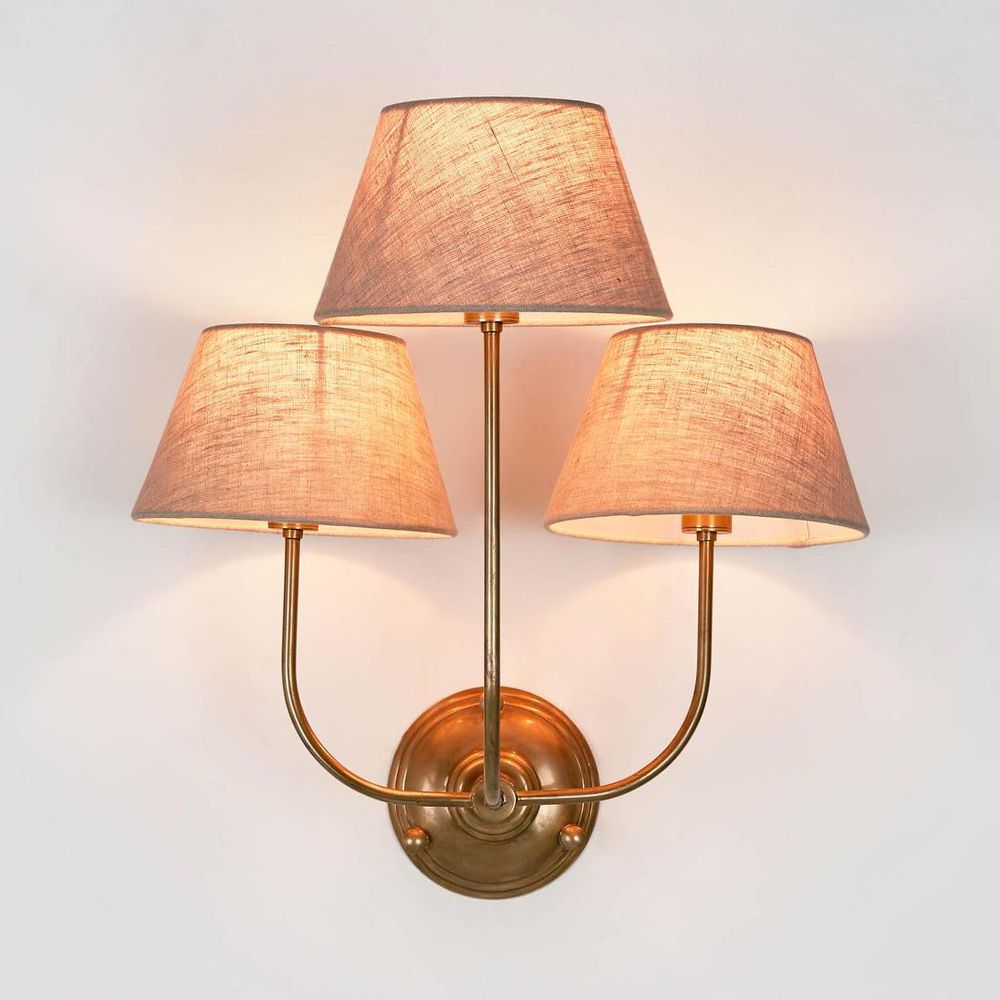Our Trilogy lamp is traditional Victorian design with three curved arms wall light in antique brass or silver, with choice of coloured shades for the perfect combination and add character to older homes. With rectangular backplate, curve arm and cream candle sleeve, these will result rich warm and authentic aged look and feel which cannot be replicated. Recommended fabric lamp shade is ring fitting shade with diameter 7 or 8 inch on bottom, and recommended lamp bulb is candle shape type of globe. ADDITIONAL FEATURES * The lamp holder takes three E14 filament bulbs clear glass max 40W with candle shape * Standard Australian domestic fitting [download spec sheet]