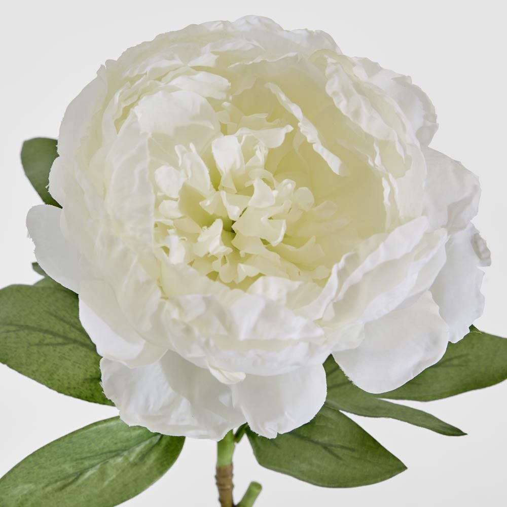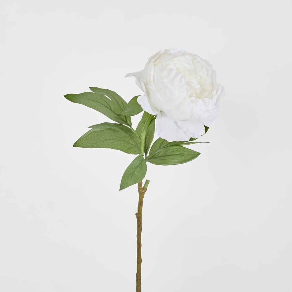 Peonies are known as the queen of flowers and this stunning peony comes in a dazzling white colour. The large white flower features delicate broad petals and the surrounding leaves come in a lifelike green with vein detailing. Perfect as an ornamental decoration. - 70cm tall - Dazzling white colour - Lifelike with realistic leaves - Versatile ornamental flower Materials: Made of plastic and polyester