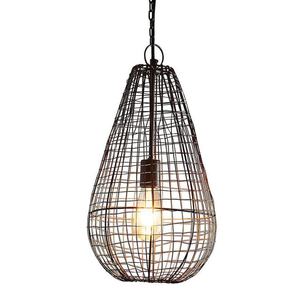 An open wire weave pendant in rust finish that creates visual interest while maintaining an open feel to the room. The design is inspired by cray fishing traps
