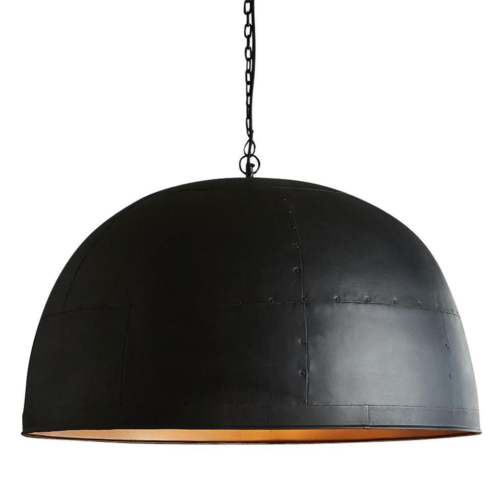 An over-sized riveted dome with a matte black exterior and a dramatic red interior.