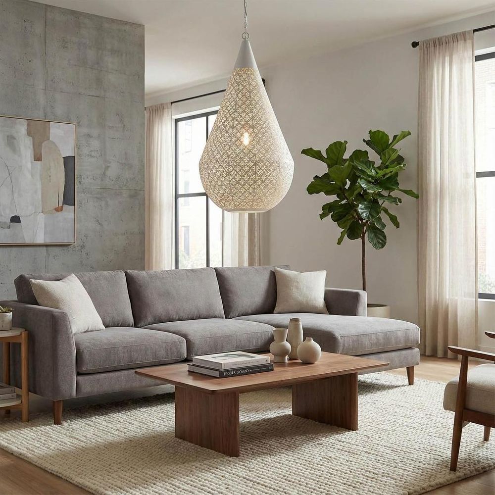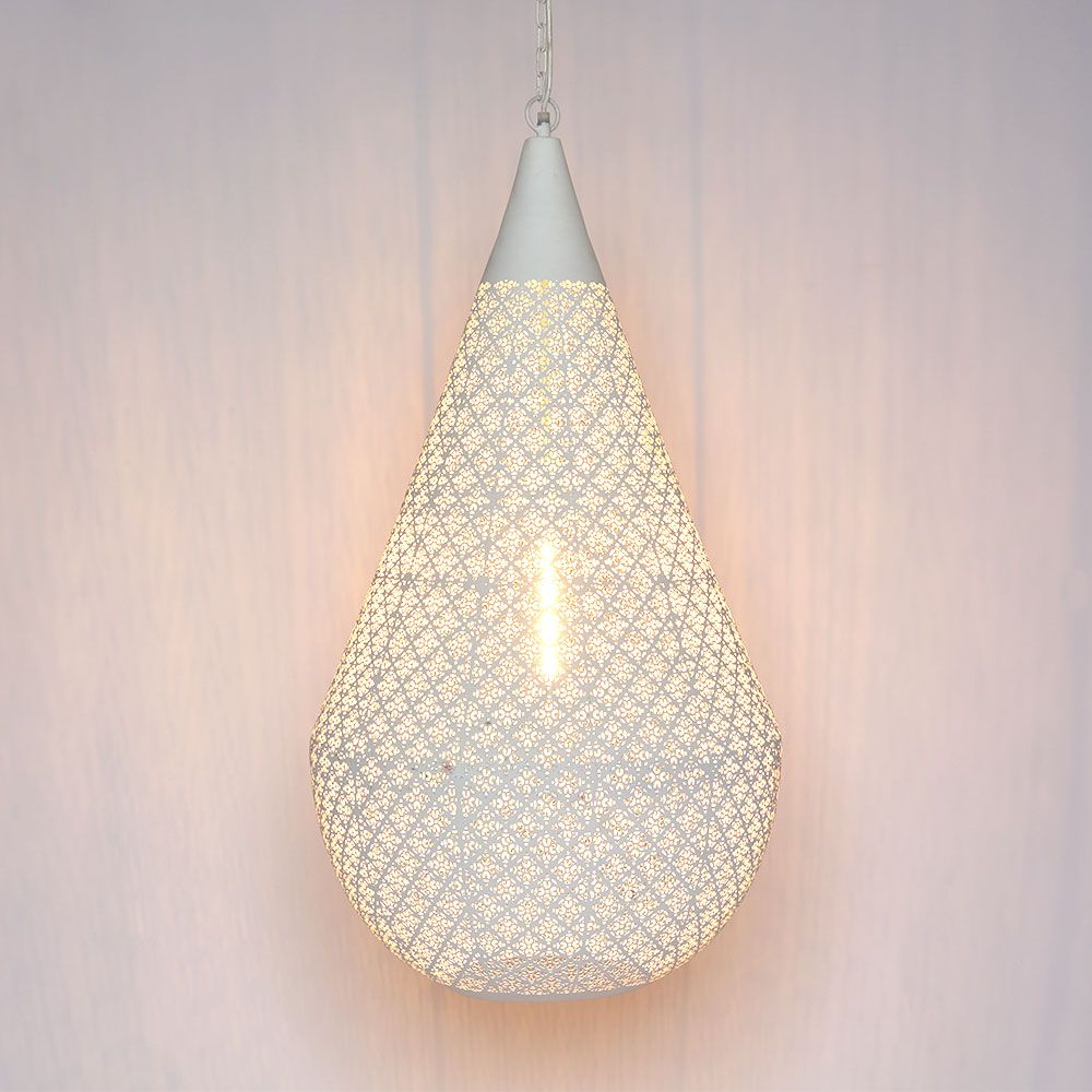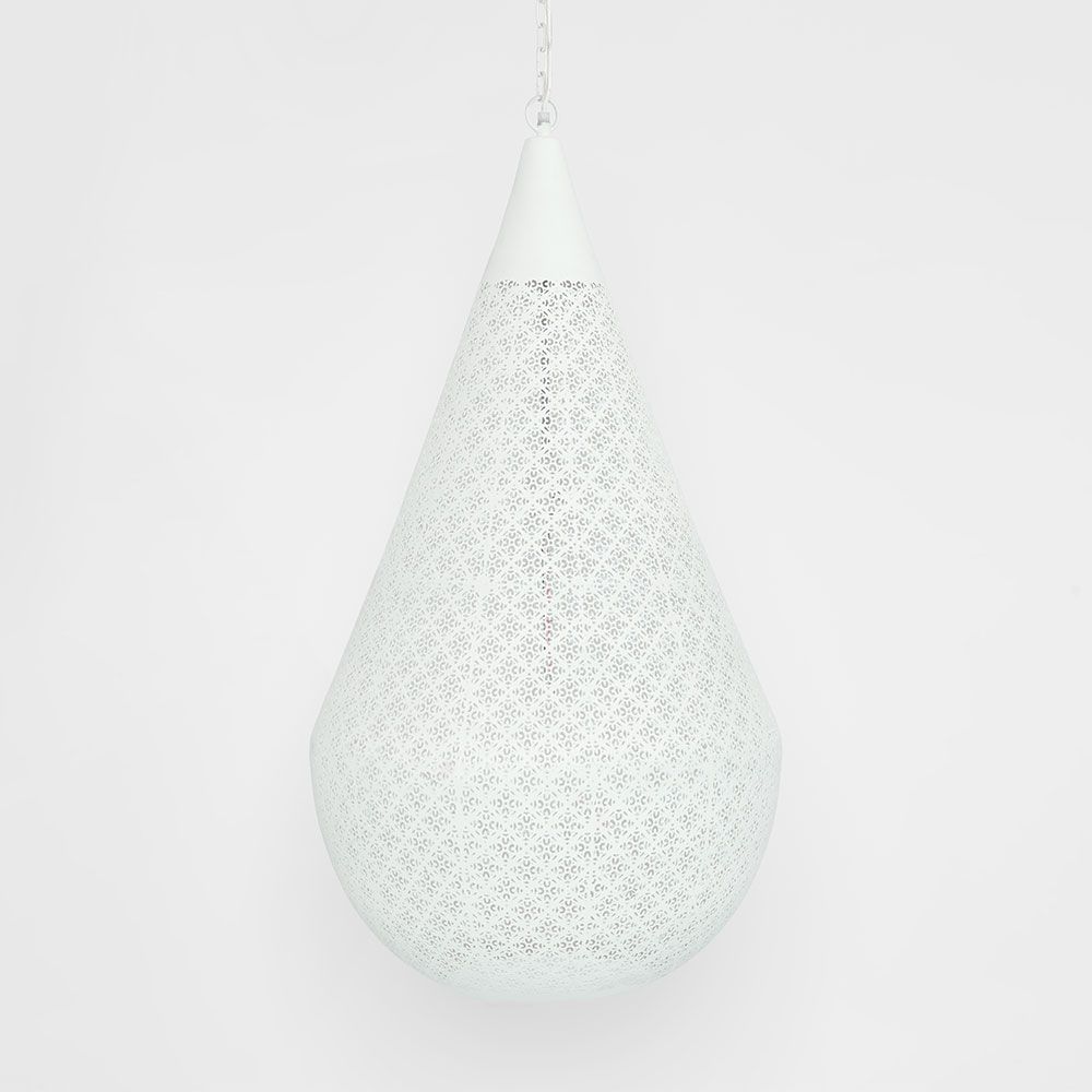 An impressive large teardrop pendant featuring a delicately-patterned perforated matt white shell.