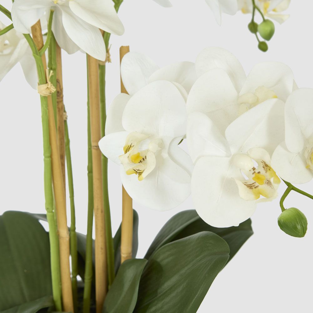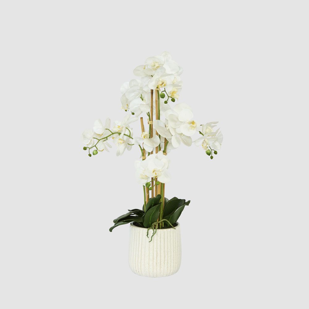 Say hello to eternal blossoms that promise to brighten your day, every day with our artificial Real Touch Orchid In Ceramic Pot. Delicate white blooms gracefully dance atop slender stems, offering an everlasting display of natural beauty. Nestled within a pristine white ceramic pot, complete with exposed roots and lush dark green leaves, this lifelike beauty exudes elegance from every angle. Perfect for adorning the living room, brightening up a windowsill, or enhancing the ambiance of your office.