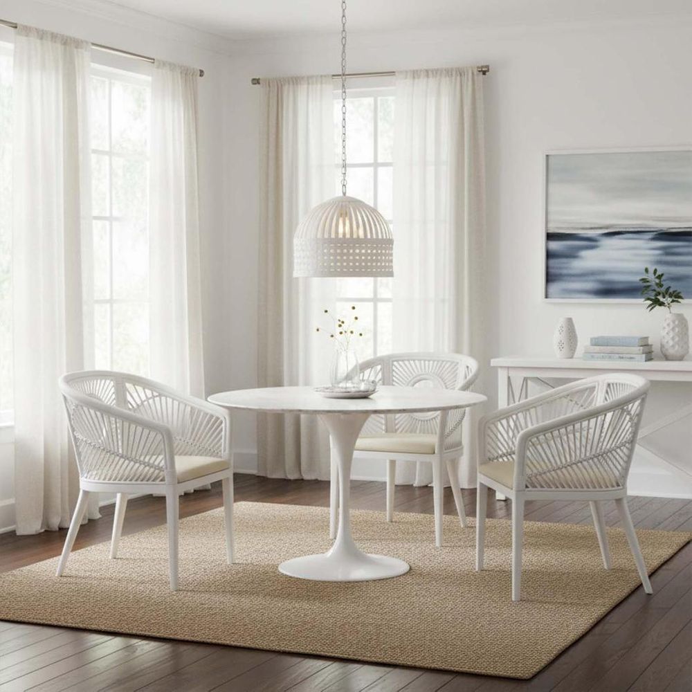 Cast a spell of industrial allure in any room with our Small Esch Ceiling Pendant in Antique White. Crafted with an intricate iron cage design, this pendant features individual lengths of iron strips woven together and held in place by rivets, creating a captivating play of light and shadow. Suspended beneath a graceful dome and adjustable metal chain, it's the perfect statement piece for adding sophistication to your living area, dining area, or covered outdoor space, casting a warm and inviting glow wherever it hangs.