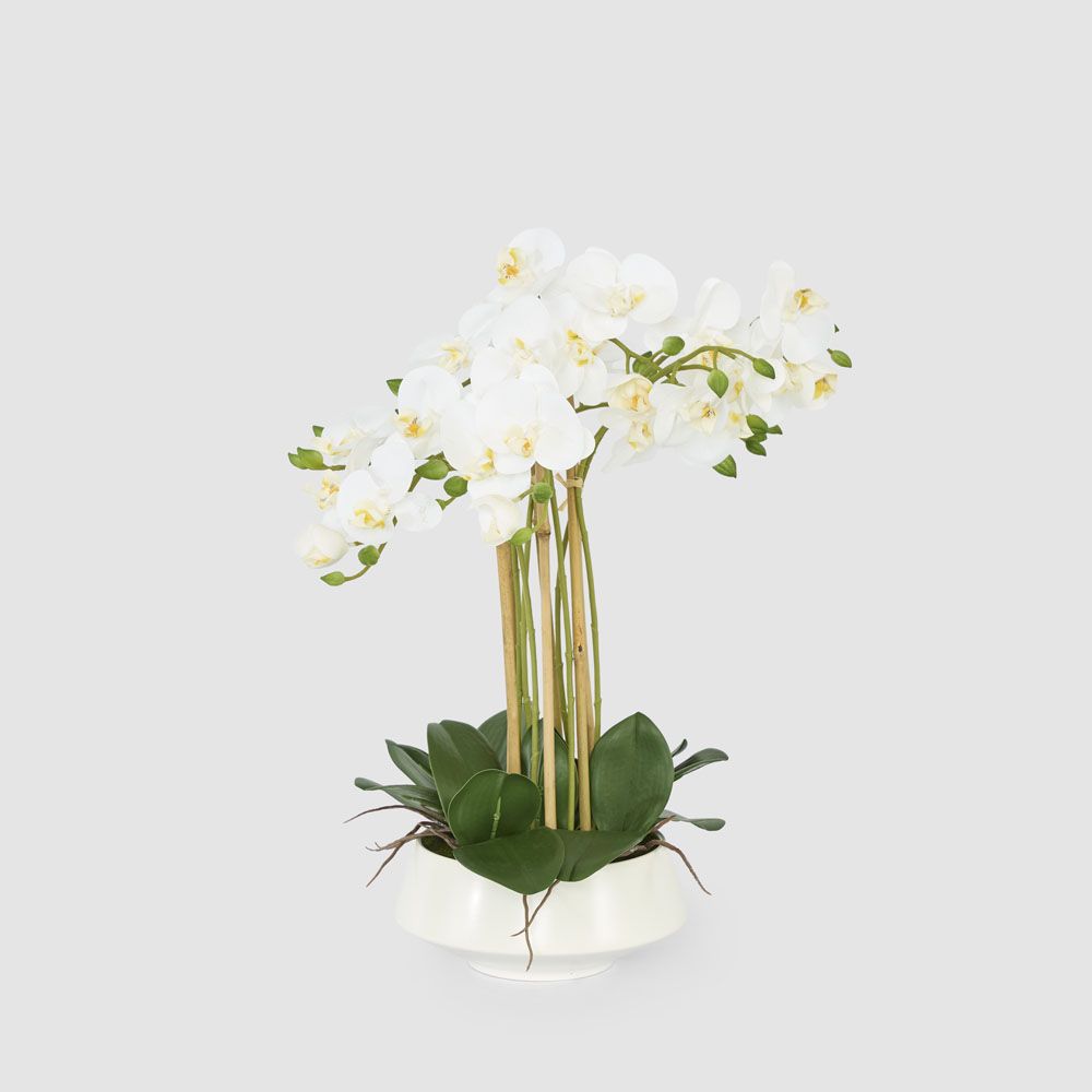 Let your space radiate an aura of refined sophistication with our artificial Large White Orchid in a White Pot. Delicate white blooms and green buds adorn slender stems, nestled within a pristine white pot that boasts exposed roots and lush, thick green leaves. Whether gracing your entryway, accentuating your dining area, or bringing life to your office space, this stunning ensemble promises to infuse sophistication into any space.