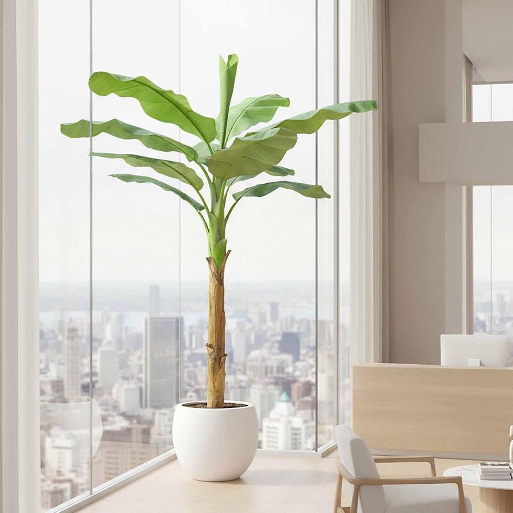 Experience the regal beauty of our artificial Royal Banana Tree. Nestled in a sleek black pot, this lifelike tree infuses any indoor space with an exotic allure, from intimate living rooms to bustling event venues, evoking the ambiance of a lush paradise wherever it resides. Enjoy the mood-boosting benefits of biophilic design and the convenience of low maintenance, all without the hassle of watering, fertilizers, or pruning. Plus, its hypoallergenic properties ensure a worry-free indoor environment. No assembly required—just a simple dusting with a static feather duster to keep it looking pristine. Disclaimer: To assist you in selecting the right planter size, the diameter of the tree pot ranges from 15-30 cm. Please ensure your chosen pot, planter, or urn has a larger diameter. Additionally, please note that the height of the trees may vary depending on the tree leaves. If you need more precise guidance, feel free to contact us, and we’ll be happy to provide you with exact measurements and assist you further