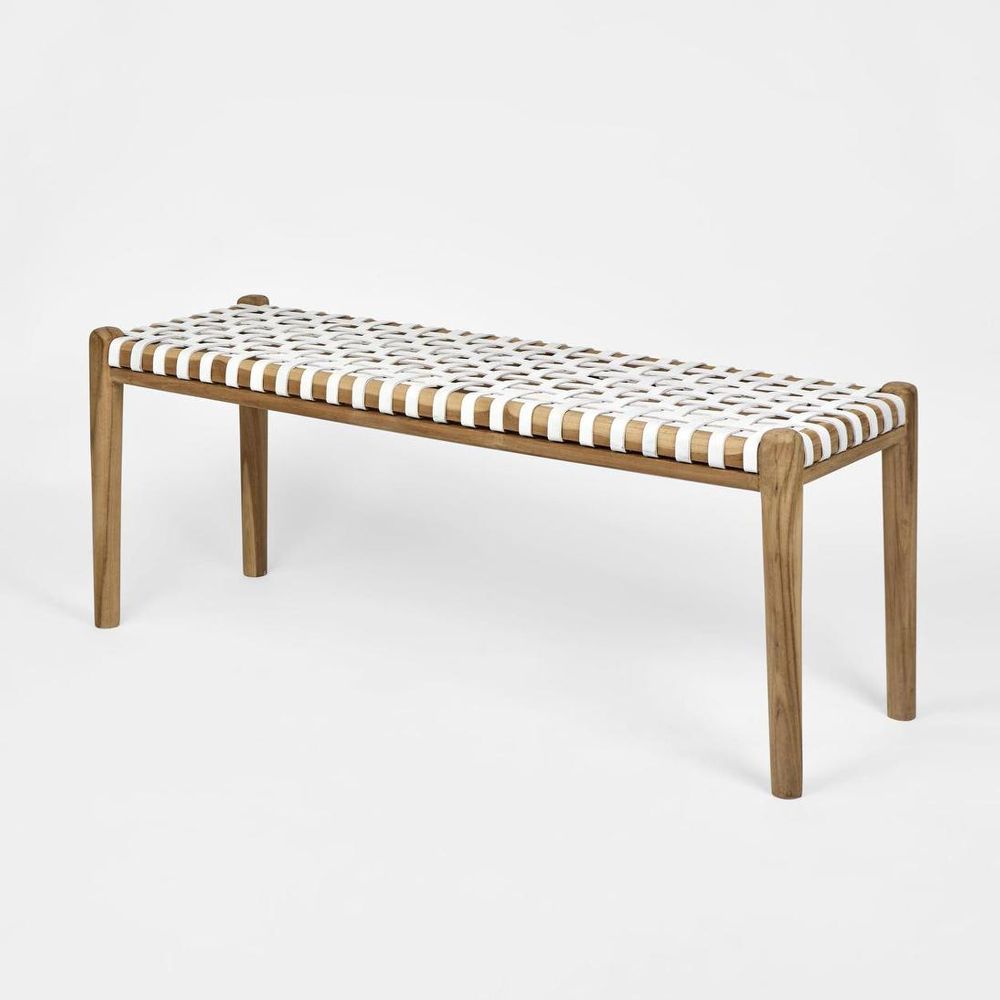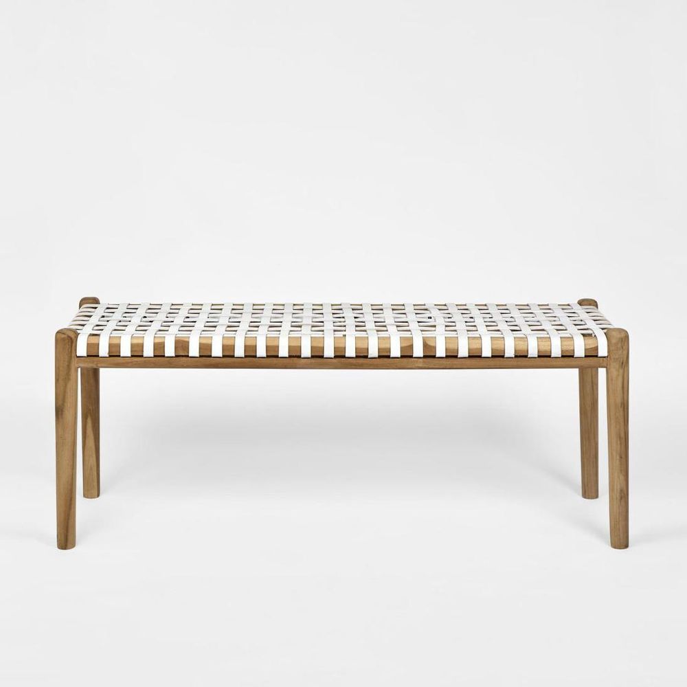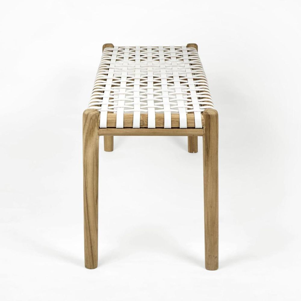 Steal the spotlight in any space with our Gerti Bench. It features artfully woven white leather strapping against a solid teak wood frame, lightly oiled to showcase a rich natural wood grain. Whether as a chic dining room seat, a stylish addition to the end of your bed, or a statement piece in your hallway, the Gerti Bench offers versatility and sophistication to elevate any setting.