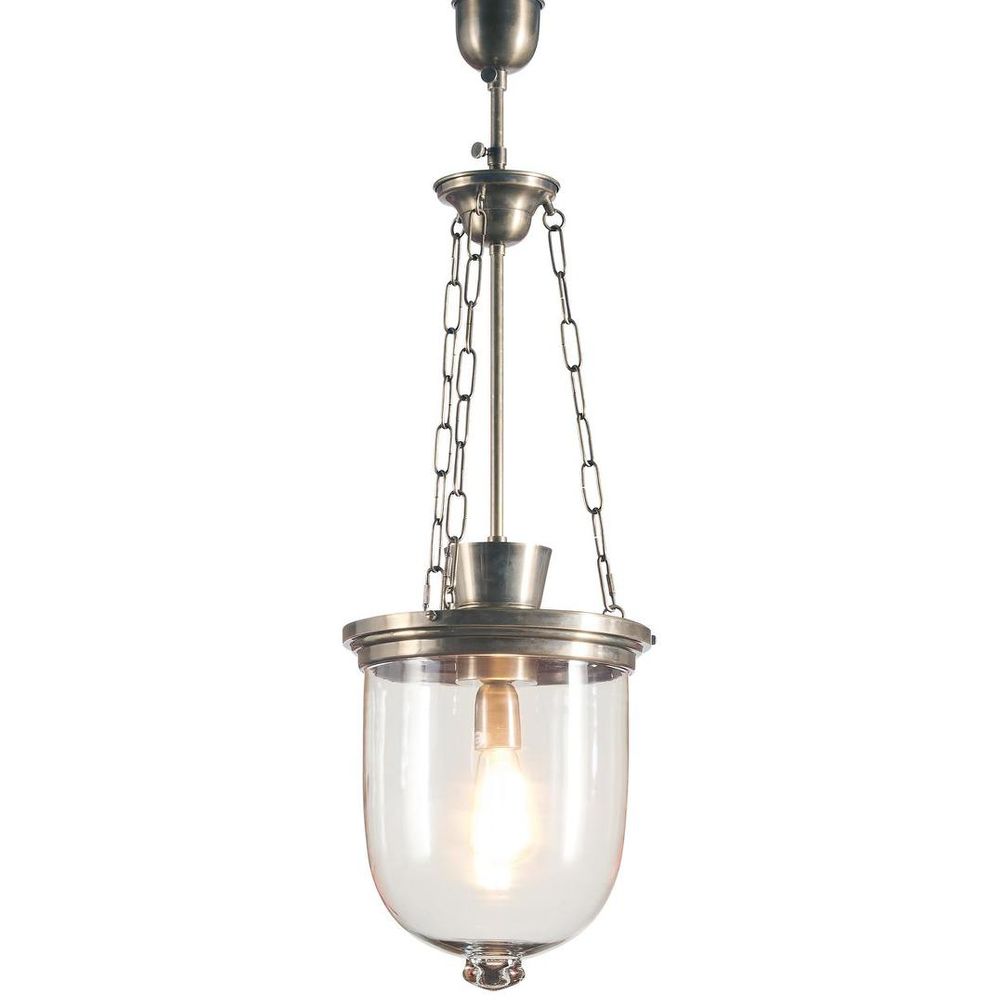 Our Ashford is clear glass hanging lamp with bell-jar shape and close brass lit, to add modern simplicity over kitchen islands or bars. Three matching colors chains are installed to weight the glass shade and make balance beside to give industrial look and feel fitting. Two colors are available, antique silver and brass. Truly gorgeous transparent glass shade which is significant point of this sleek modern fixture island. ADDITIONAL FEATURES • Standard Australian domestic fitting • Ceiling rose has a matching finish with the base • Lamp holder takes a standard E27 light bulb at 60 watt max Please note glass components are handmade and therefore small air bubbles, slight defects and colour variations may naturally occur during the glassblowing process. [download spec sheet]