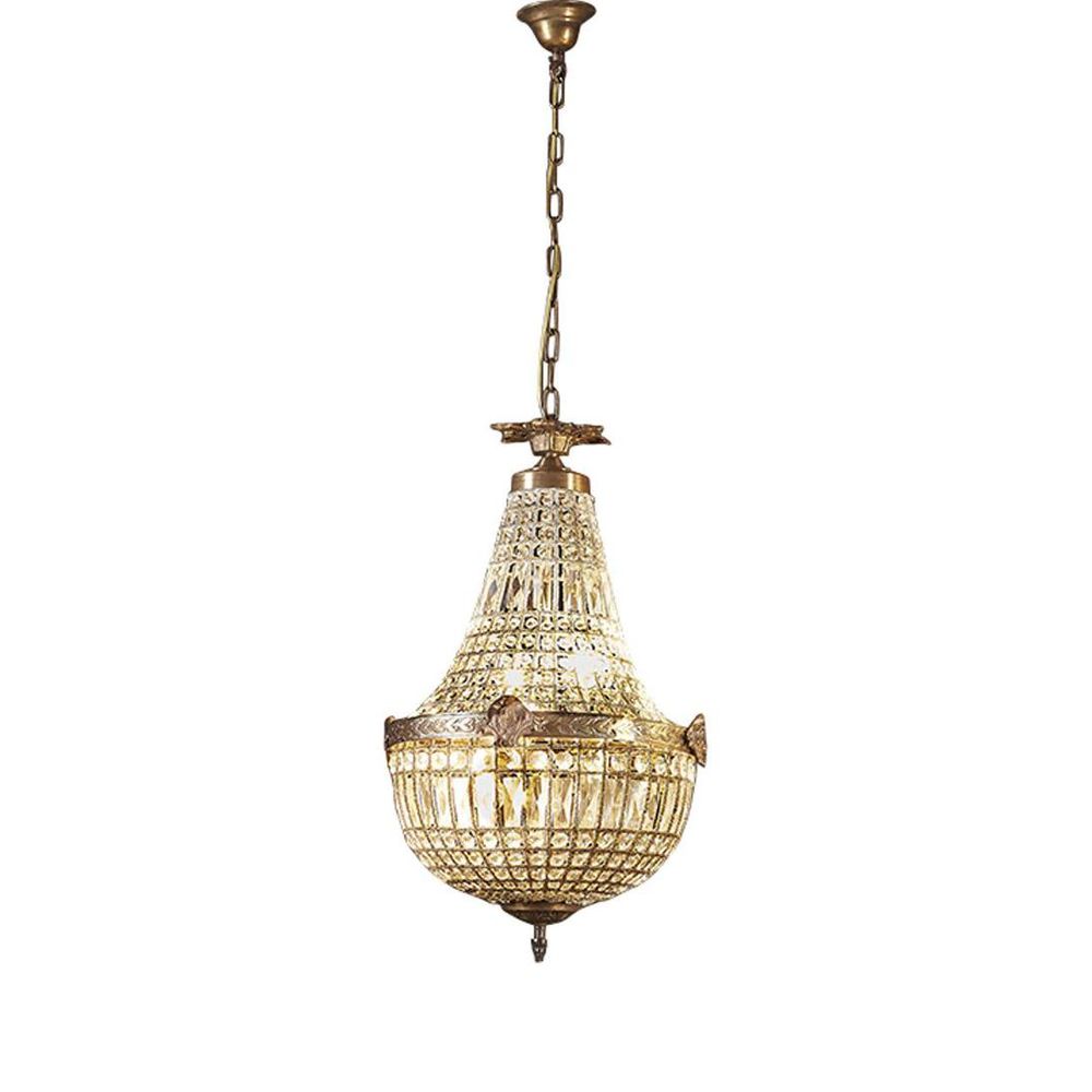 This is antique brass Empire chandelier with hand-cut beveled glasses shaped like crystal glass. There are four different sizes but only with large and extra-large ones have round ball shape on top fitting. The brass has patina to look like old world vintage traditional appearance. The light shades out of the chandelier will look beautiful anywhere to make our guests to feel welcome in our home. ADDITIONAL FEATURES • Standard Australian domestic fitting • Ceiling rose has a matching finish with the base • 1.5m chain and cord height is adjustable • Lamp holder takes a standard E27 light bulb at 40 watt max Please note that most glass components are handmade and therefore small air bubbles, slight defects and colour variations may naturally occur during the glassblowing process. [download spec sheet]