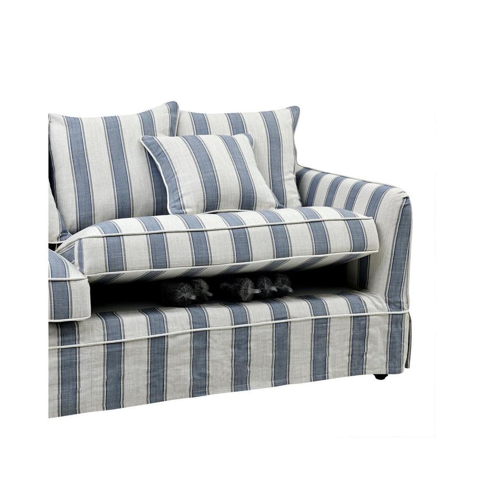 Transform your ordinary seating into a cozy retreat with our 3 Seat Slip Cover in Noosa Blue Sky Stripe. Crafted to perfection, this slip cover is designed to seamlessly pair with our Noosa 3 Seat Sofa Base and Cushion Inserts, offering a quick and effortless way to elevate your living space while providing practical protection for your sofa.
