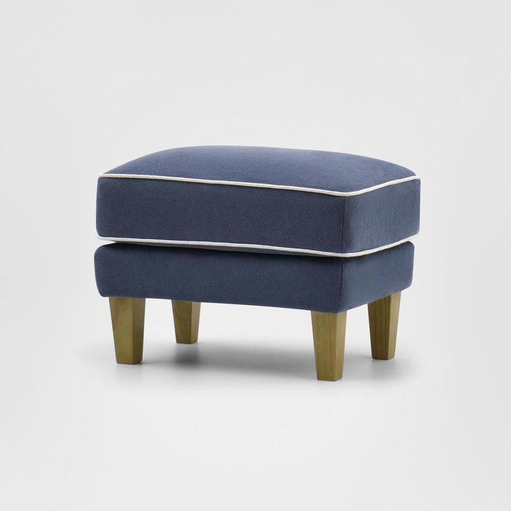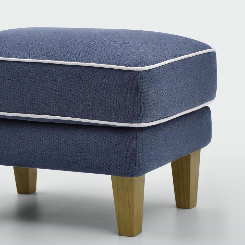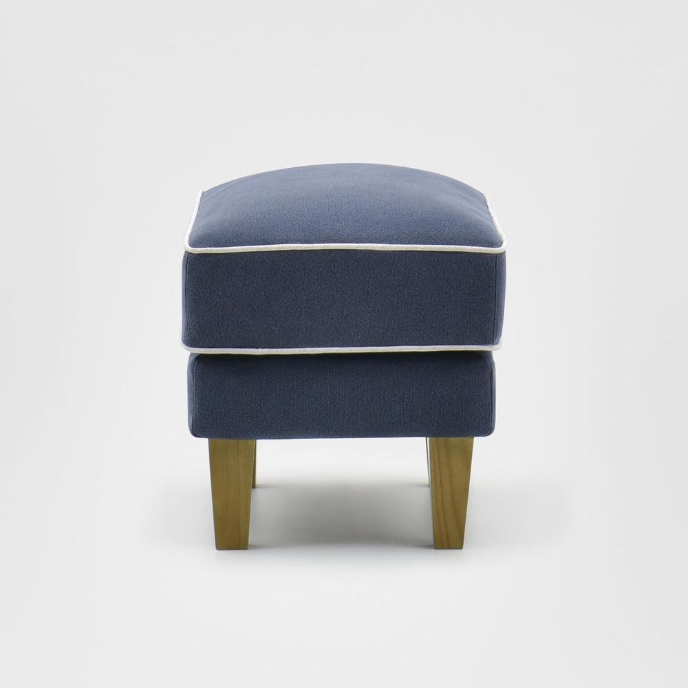 Complete the look of your Bondi collection with our Bondi Ottoman in Navy with White Piping, perfect for resting tired feet or as an extra seating option. With its classic design and wooden tapered legs, this ottoman is more than just a place to rest your feet, it's a statement piece in its own right. Pair it with our Bondi Armchair or any other piece from our Bondi collection for a cohesive and effortlessly chic look that will transform your living space into a haven of relaxation.