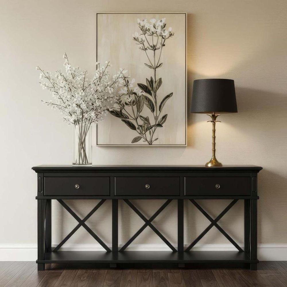With its three spacious drawers and convenient low shelf, our Sorrento 3 Drawer Console in Black offers ample storage for your everyday essentials while making a striking statement in your hallway, living room, or entryway. The intricate cross detailing adds a touch of sophistication, seamlessly marrying classic and contemporary design elements to enhance your modern home decor.