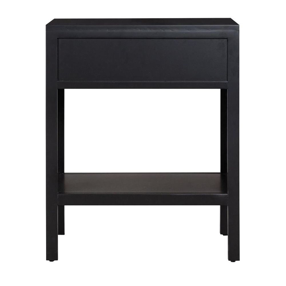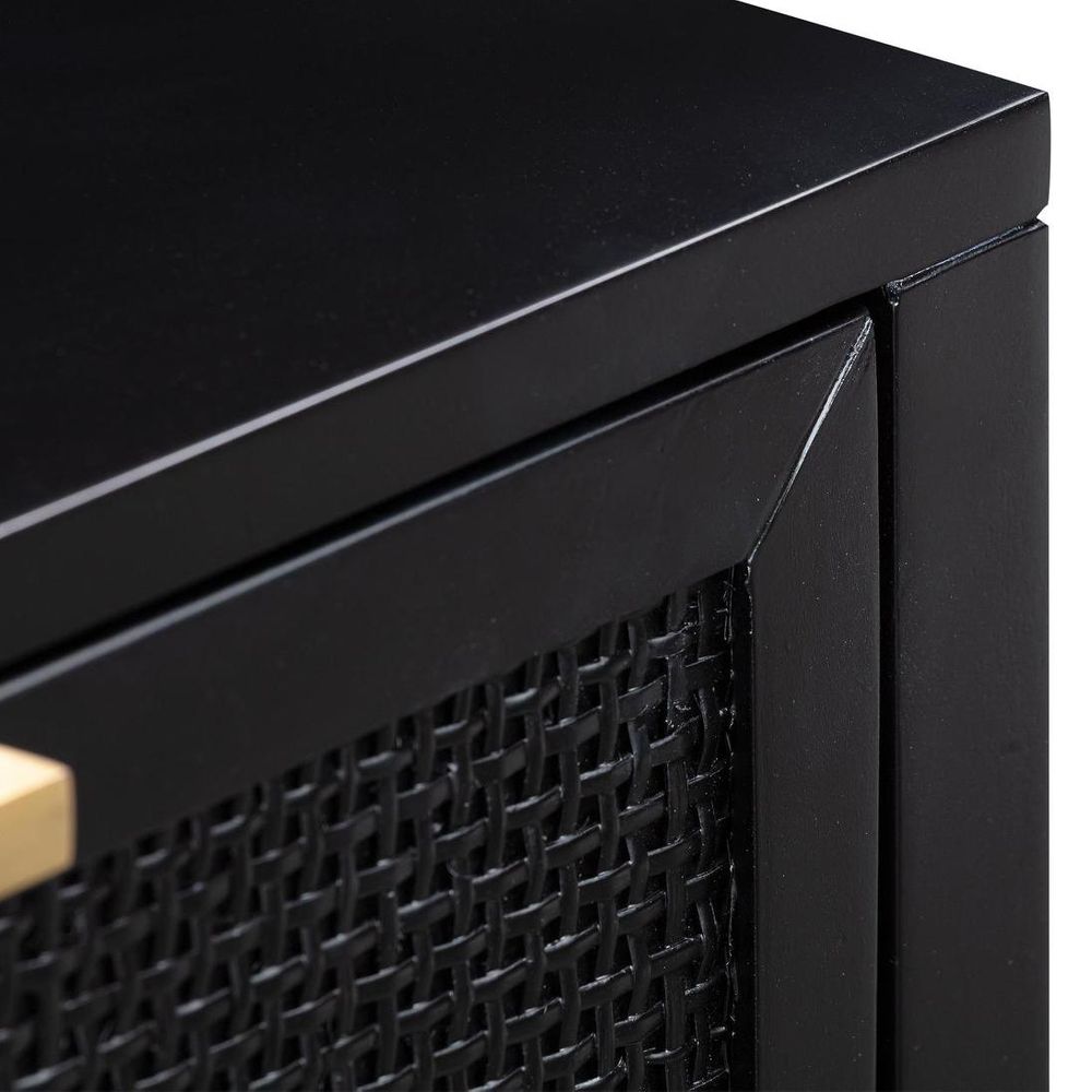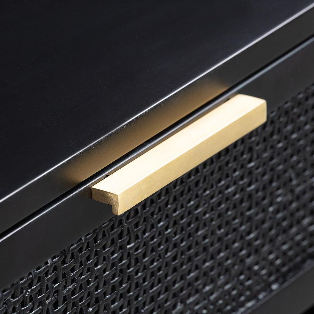 Meet your bedroom's new best friend, our Santorini Bedside Table in Black. Crafted from sturdy solid wood, it features a single pull-out drawer adorned with a glamorous gold pull and a charming rattan woven insert on the front. Perfect for keeping your nighttime essentials close at hand while adding a touch of sophistication to your bedroom decor. Complete the look by pairing it with other pieces from our Santorini collection for a cohesive and sophisticated space. Assembly : Not Required