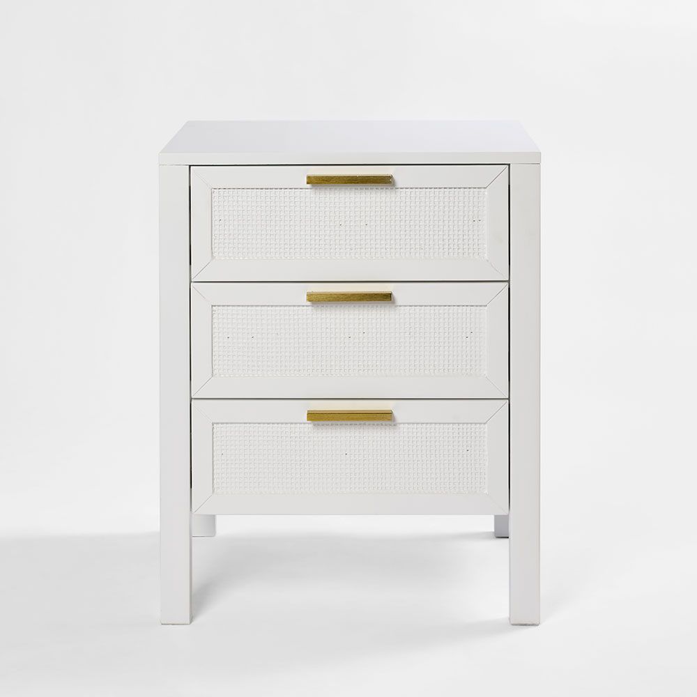 Make your nighttime essentials accessible and stylish with our Santorini Bedside Drawer in White. Crafted with a solid wood frame, this bedside table features three pull-out drawers, each accented with a chic gold drawer pull and charming rattan woven insert on the front. Perfect for keeping your nighttime essentials close at hand, this piece adds a touch of sophistication to any bedroom. For a cohesive and elevated aesthetic, pair it with other pieces from our Santorini collection.