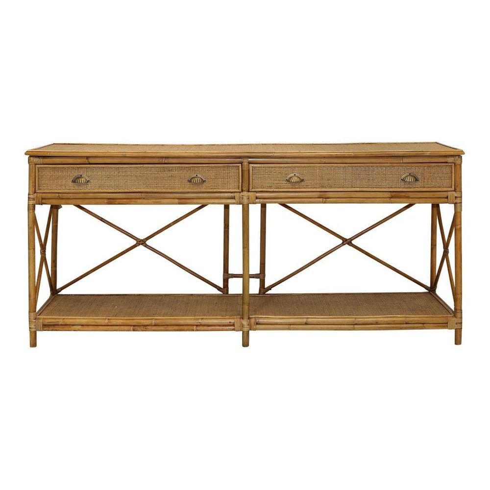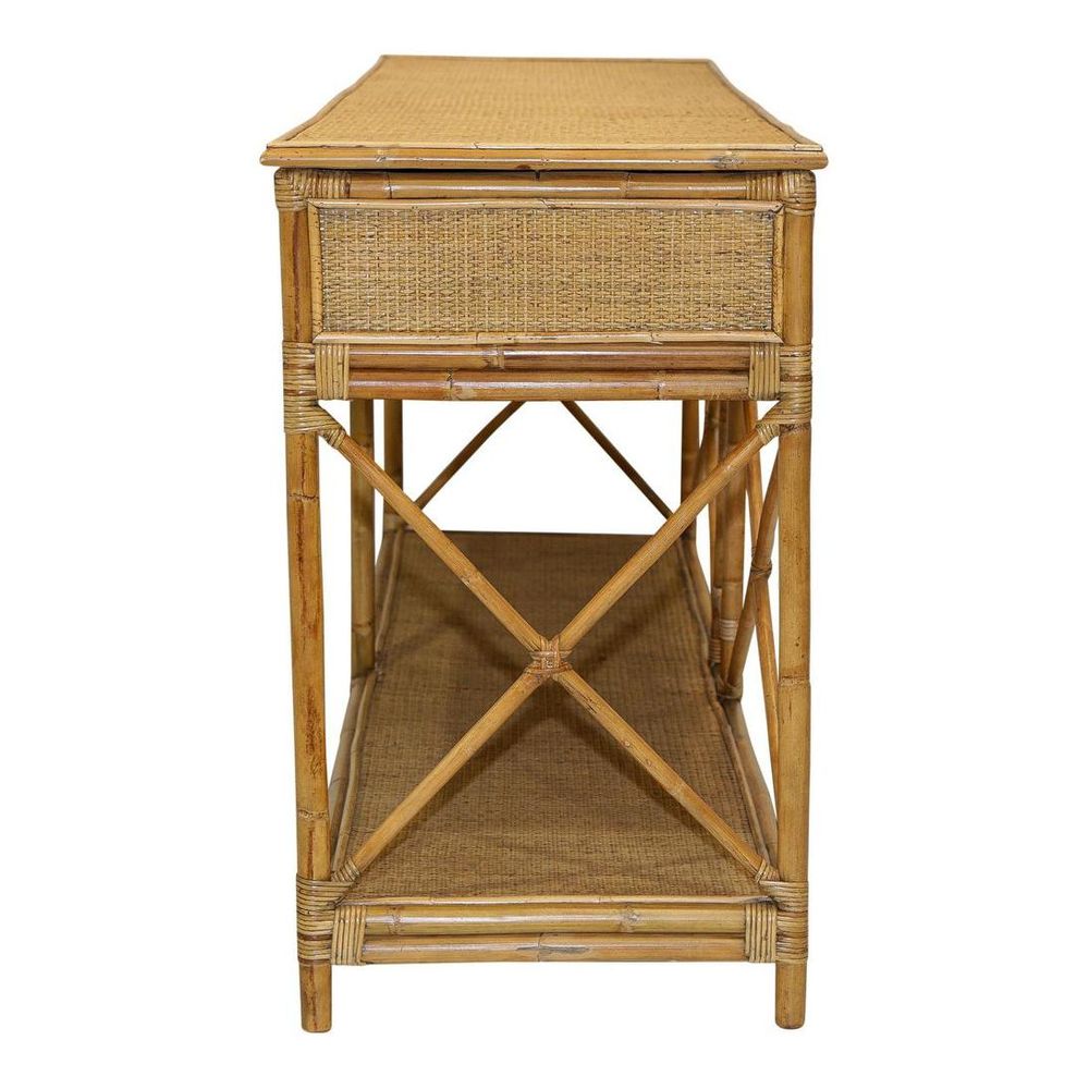 Keep clutter at bay while elevating your décor with our Large Cayman 2 Drawer Rattan Console. With its double drawers and low-level display shelf, this console offers endless opportunities to showcase your favorite decor pieces or hide away clutter in style. The elegant cross-back detailing adds a touch of sophistication to any space, making it the perfect addition to your entryway, hallway, or living room. Please note: Rattan is not designed for full outdoor use. If placed outdoors or even in covered outdoor areas, it may weather, fade, or change over time due to exposure to sunlight and moisture. We recommend indoor use or placing it in well-protected areas.