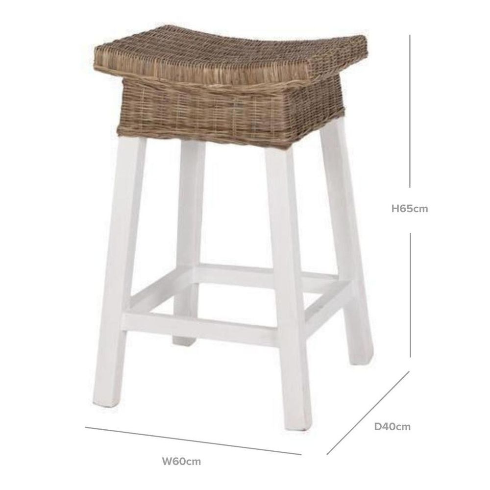Get transported to your favorite beachside retreat with every sit on our White Wood and Rattan Barstool. Crafted with a solid wood frame and adorned with woven rattan detailing, this barstool brings a touch of coastal charm to any space. The backless design ensures a seamless flow in airy coastal homes, while the combination of textural rattan and crisp white frame adds a modern twist. Perfect for perching at your kitchen counter or adding a laid-back vibe to your breakfast bar. Please note: Rattan is not designed for full outdoor use. If placed outdoors or even in covered outdoor areas, it may weather, fade, or change over time due to exposure to sunlight and moisture. We recommend indoor use or placing it in well-protected areas.