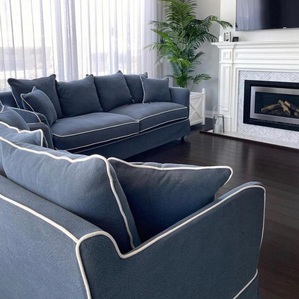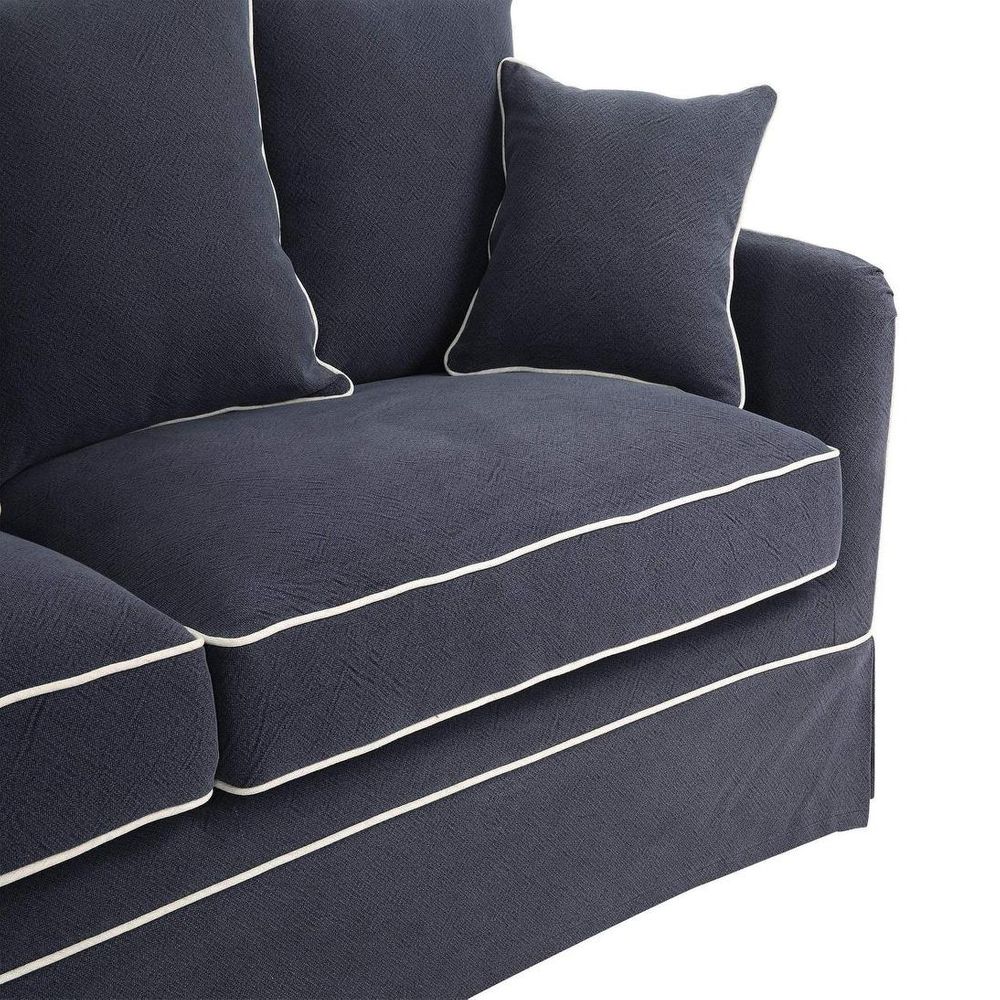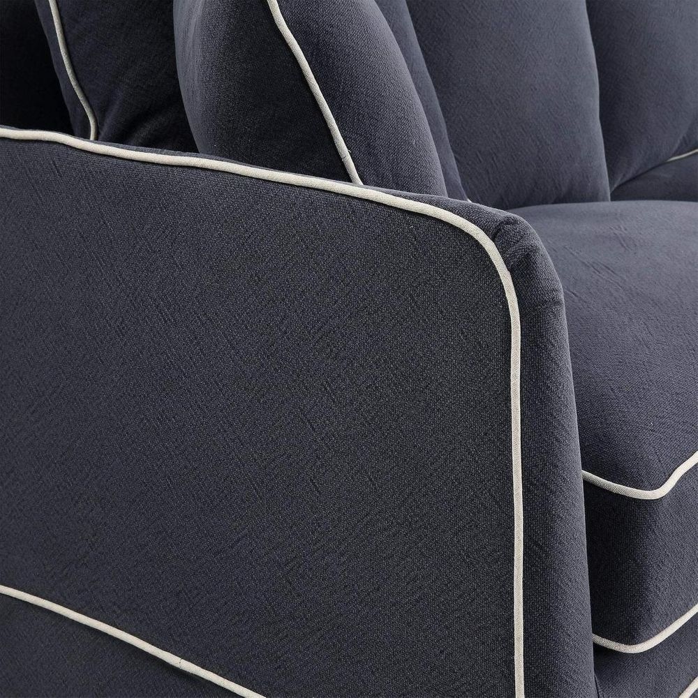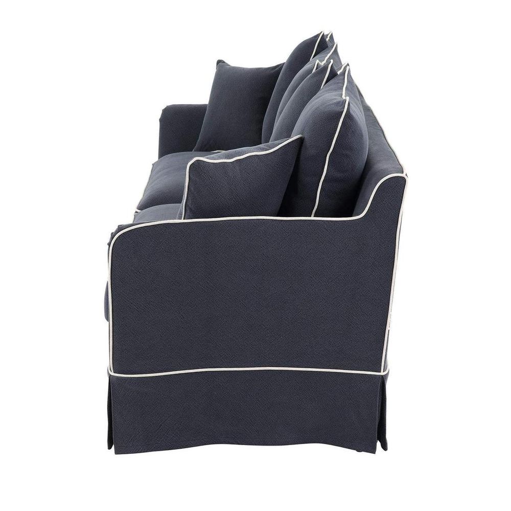 Transform your ordinary seating into a cozy retreat with our 3 Seat Slip Cover in Noosa Navy with White Piping. Crafted to perfection, this slip cover is designed to seamlessly pair with our Noosa 3 Seat Sofa Base and Cushion Inserts, offering a quick and effortless way to elevate your living space while providing practical protection for your sofa.