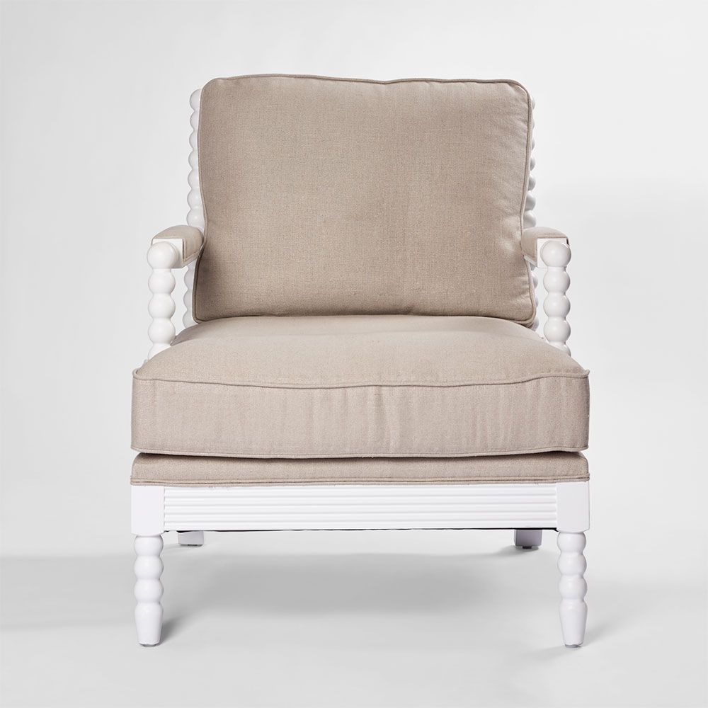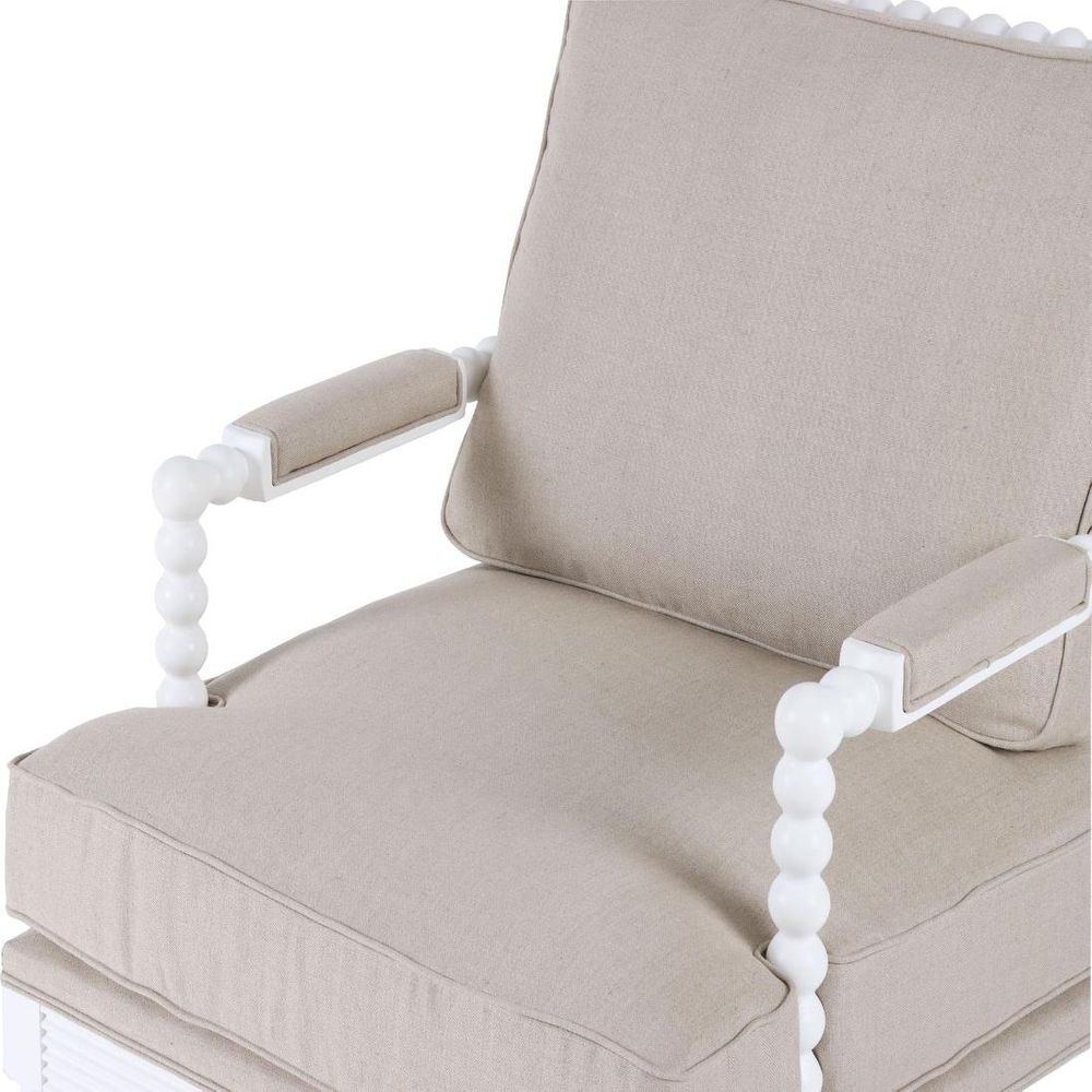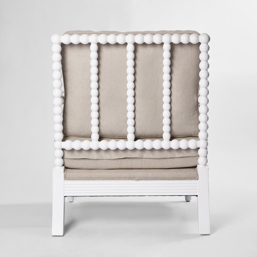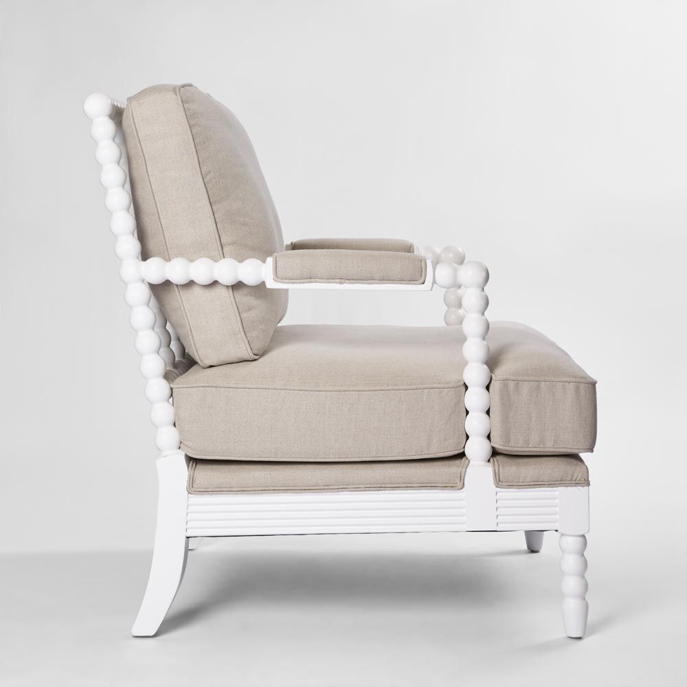 Take a seat in timeless elegance with our Elizabeth Bobbin Hamptons Armchair in White. Meticulously crafted with a robust wooden frame and exquisitely carved bobbin legs, this armchair transcends mere furniture, it's a declaration of discerning style. Sink into luxurious comfort with its foam-filled seat and back cushions, accented with elegant piping, while the upholstered armrests provide an inviting sanctuary for moments of relaxation and reverie.