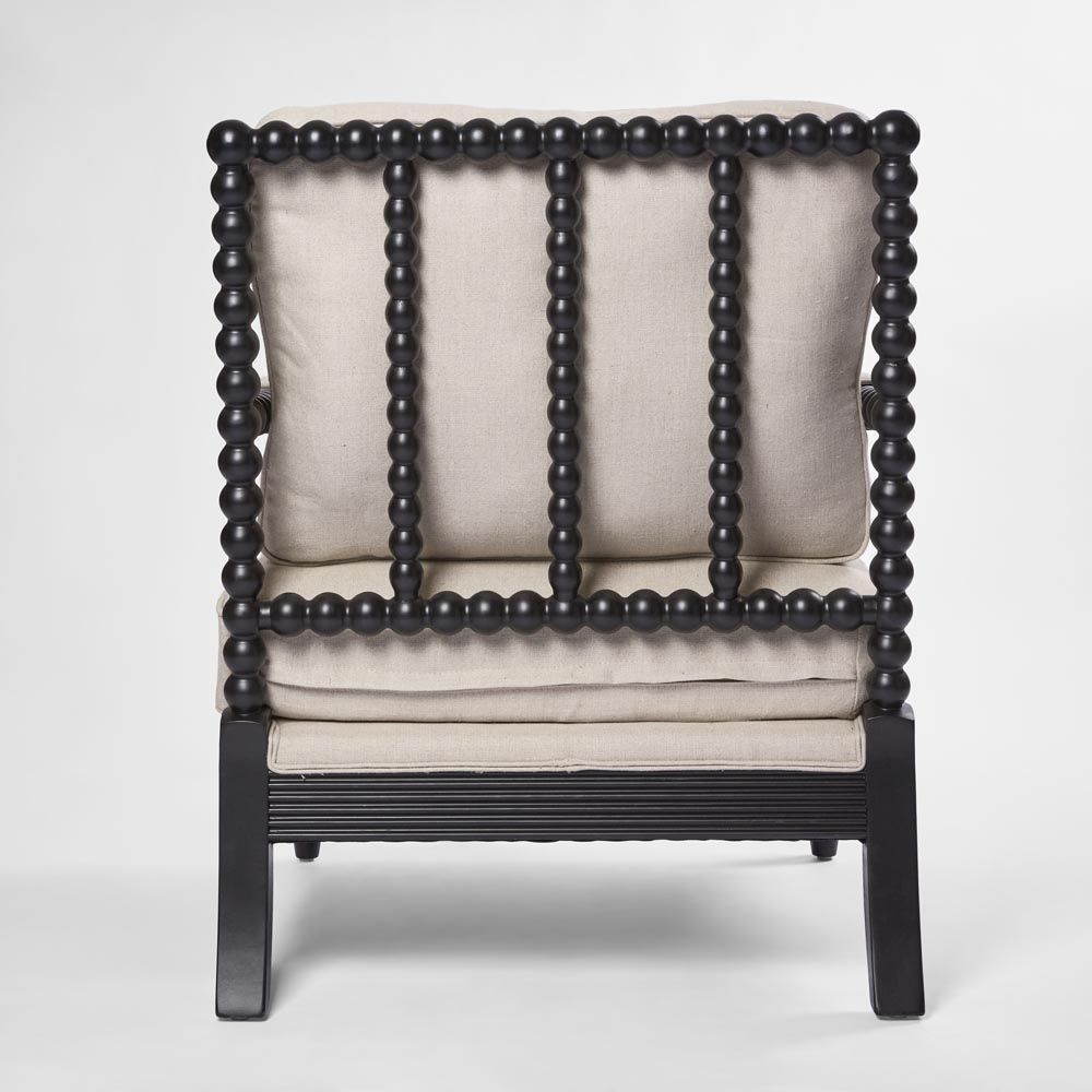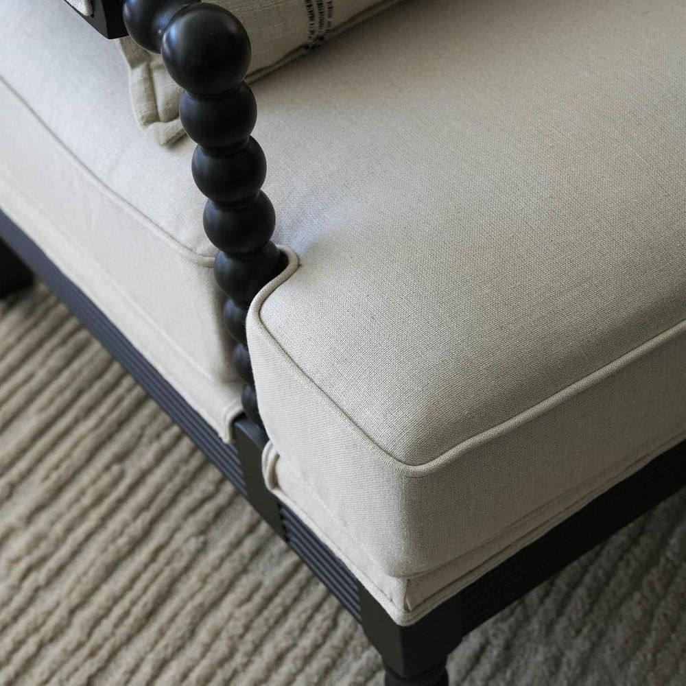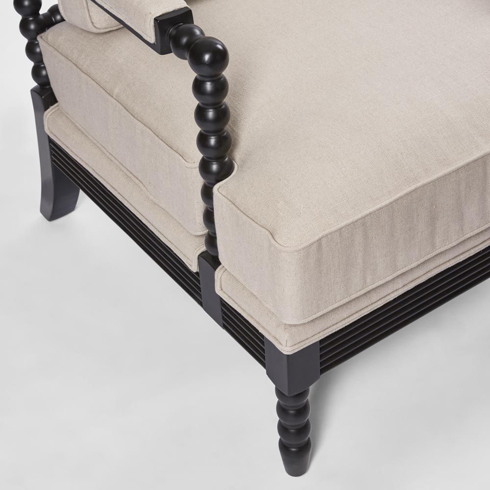 Take a seat in timeless elegance with our Elizabeth Bobbin Hamptons Armchair in Black. Meticulously crafted with a robust wooden frame and exquisitely carved bobbin legs, this armchair transcends mere furniture, it's a declaration of discerning style. Sink into luxurious comfort with its foam-filled seat and back cushions, accented with elegant piping, while the upholstered armrests provide an inviting sanctuary for moments of relaxation and reverie.