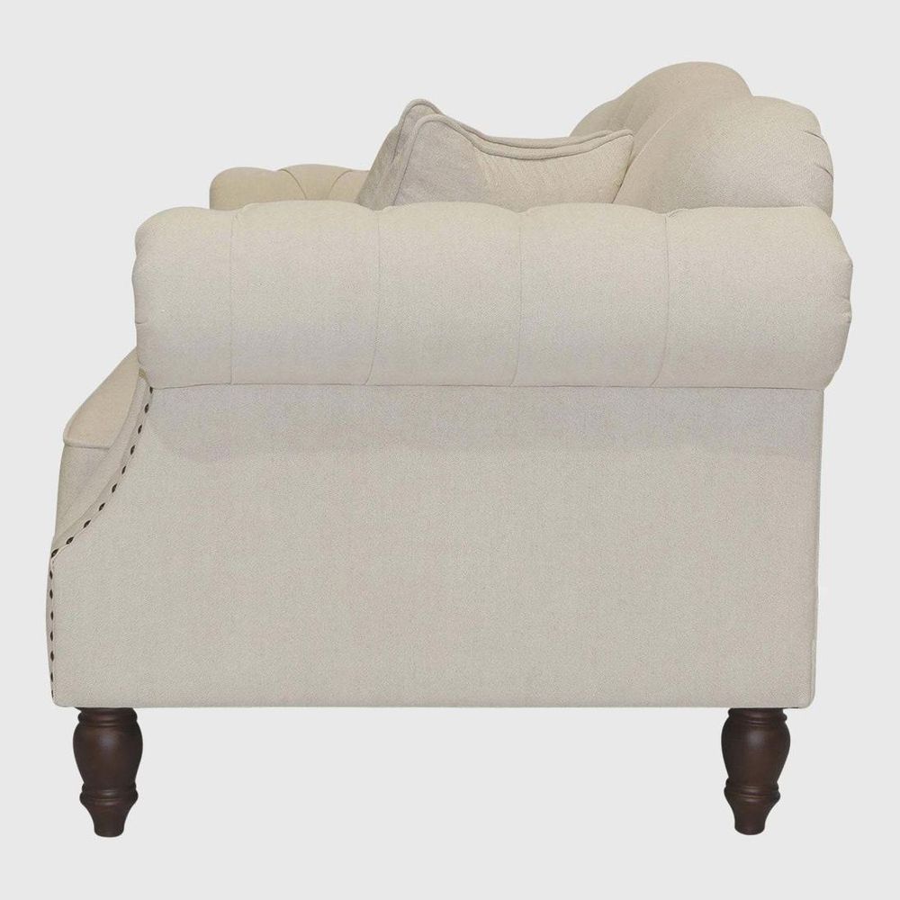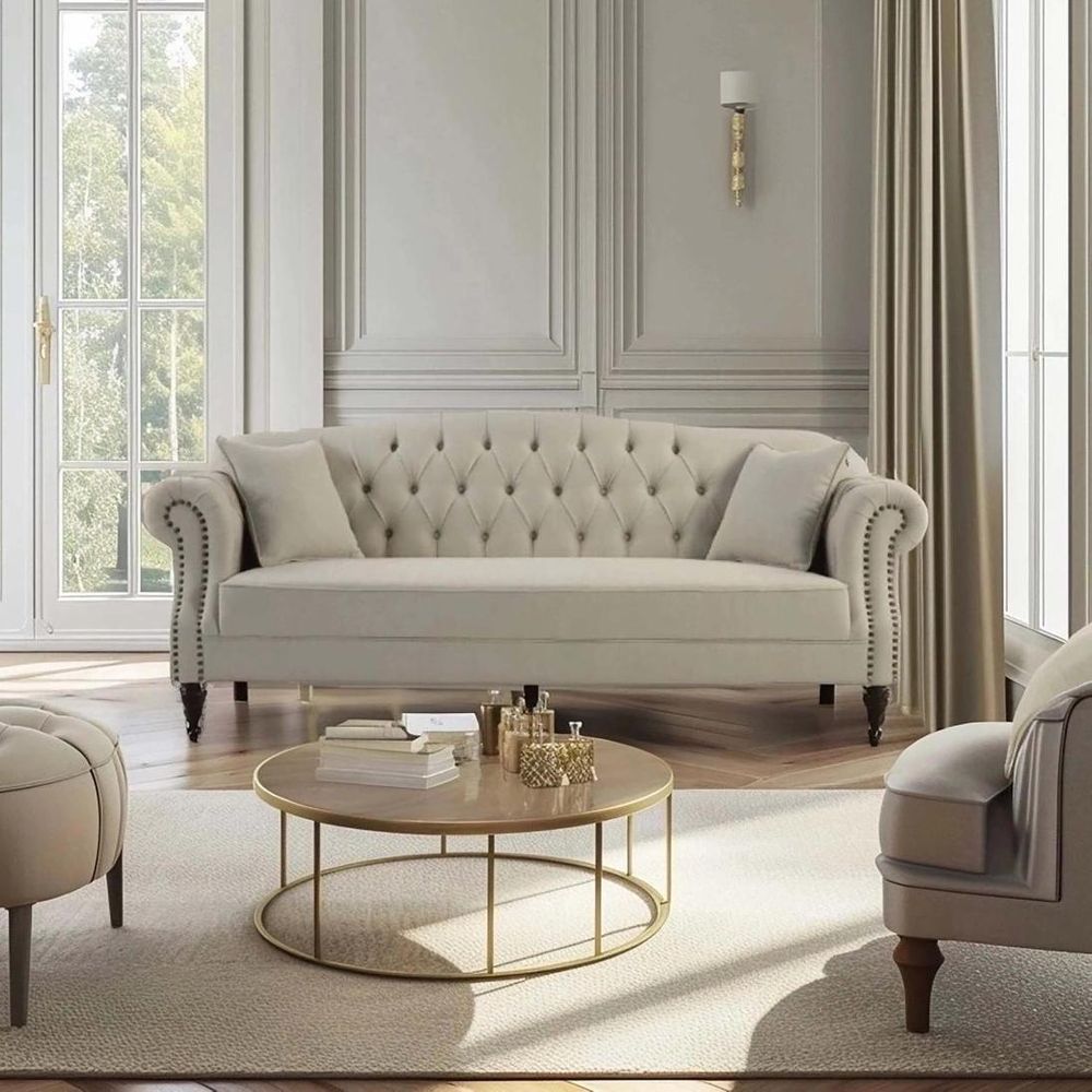 Make a lasting impression with the Vaucluse Sofa range in beige. Classic button tufted backrest & elegant set-back rolled arms for ultimate comfort featuring studded detailing. Fixed cushion seat for a refined low maintenance sofa with high-resilience foam seating for enduring comfort and support. Sinuous steel springs tethered with high performance latex webbing provide edge to edge seat support. Reinforced solid timber frame engineered to last and backed by our 10yr frame guarantee. Ornate turned solid hardwood legs - require simple attachment by hand-screwing to base upon delivery. The base is EPE foam. The high-density foam has been tested to meet Certi-PUR requirements, complies with VOC testing under the EU RoHS Directive (EU) 2015/863, and can meet the CA117 flammability standard. The product and all its materials are free from PFAS, PFOS, and PFTE. Formaldehyde testing has been completed for all wood and glue components. All fabrics used in the product are OEKO-TEX® Standard 100 compliant.