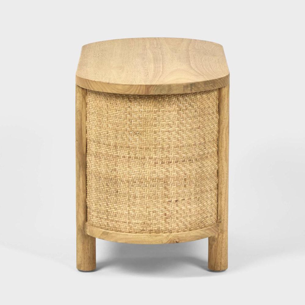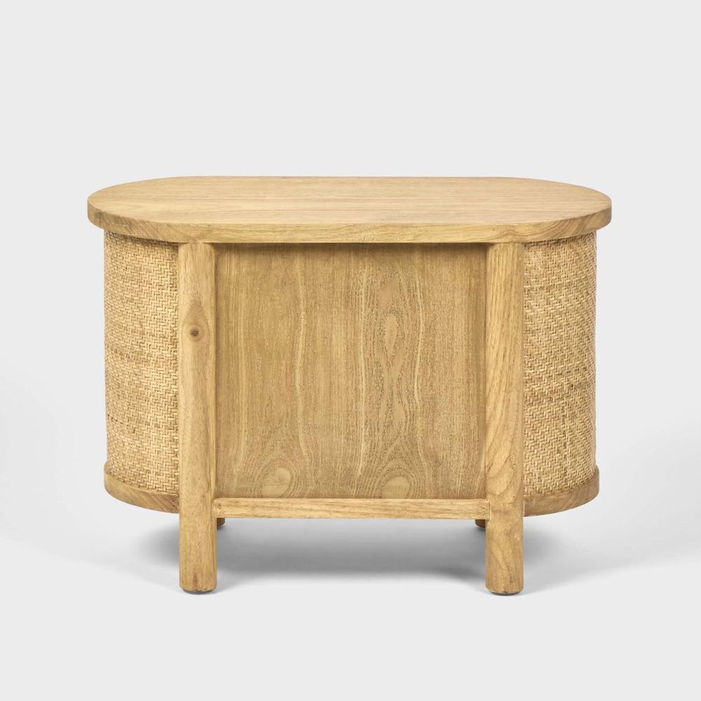Redefine your bedroom aesthetic with our Coolum Bedside Table in Natural. Crafted with a warm wood finish and adorned with woven natural rattan detailing on the sides, this bedside table adds a touch of natural warmth and texture to your space. The oval-shaped design and exposed frame exude a rustic charm, creating a cozy and inviting atmosphere. With two roomy drawers, it's not just a functional piece but a symbol of timeless style that seamlessly blends into your home decor.