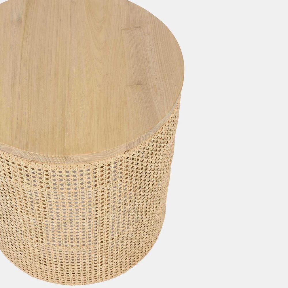 The Zoe side table shows a simple cylinder silhouette with a beautiful hand waxed wood grained 25mm natural solid sungkai wood top. It is a beautiful addition to any modern or contemporaty interior. The bamboo inner frame is clad with a woven cane rattan panel adding texture and visual interest to your living areas. Beautiful on its own or paired with similar to style with a vase or lamp.