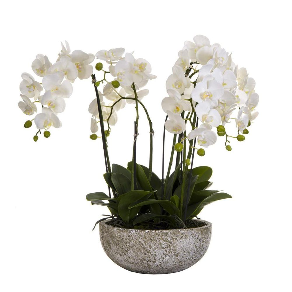 Admire the pristine beauty of white blooms and verdant green buds adorning slender stems from our faux White Orchid. Nestled within a round clay pot, its exposed roots intertwine with lush, thick dark green leaves, exuding an air of refined sophistication. Whether gracing a sunlit window sill, accentuating a chic coffee table, or bringing tranquility to a corporate office, this exquisite arrangement promises to elevate any space with its captivating charm and timeless elegance.