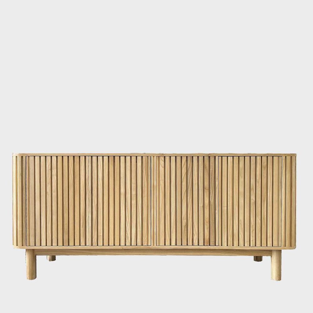 Treat your dining area to a touch of elegance and ample storage with our Vince Buffet in Natural. Crafted from solid timber wood, it features a streamlined front crafted from slatted strips that cleverly hide the unit's doors. With push-to-open doors and gracefully curved sides, it offers both aesthetic appeal and practical storage space, making it suitable for use as a serving station in the dining room or for organizing dinnerware in any space.