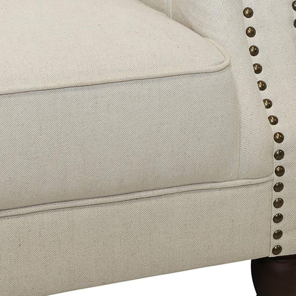 Make a lasting impression with the Vaucluse Sofa range in beige. Classic button tufted backrest & elegant set-back rolled arms for ultimate comfort featuring studded detailing. Fixed cushion seat for a refined low maintenance sofa with high-resilience foam seating for enduring comfort and support. Sinuous steel springs tethered with high performance latex webbing provide edge to edge seat support. Reinforced solid timber frame engineered to last and backed by our 10yr frame guarantee. Ornate turned solid hardwood legs - require simple attachment by hand-screwing to base upon delivery. The base is EPE foam. The high-density foam has been tested to meet Certi-PUR requirements, complies with VOC testing under the EU RoHS Directive (EU) 2015/863, and can meet the CA117 flammability standard. The product and all its materials are free from PFAS, PFOS, and PFTE. Formaldehyde testing has been completed for all wood and glue components. All fabrics used in the product are OEKO-TEX® Standard 100 compliant.