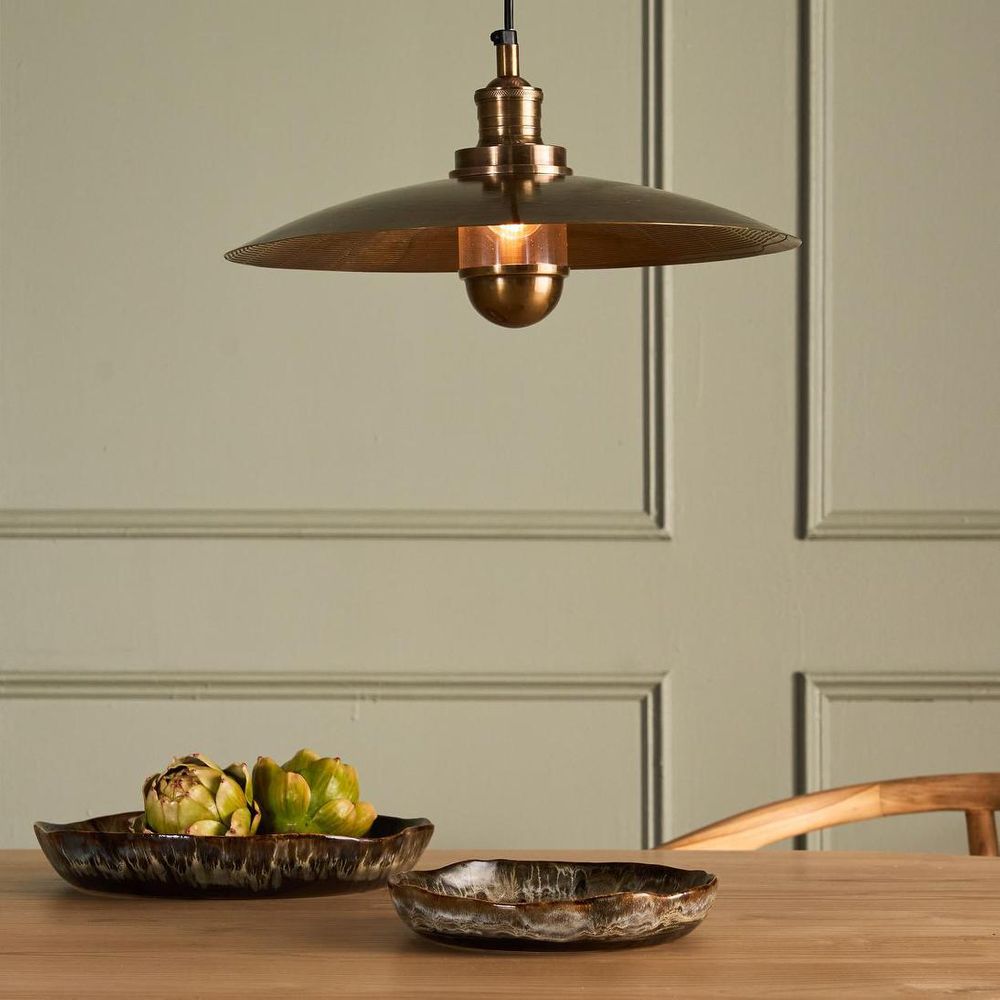 Cast a golden glow of sophistication with our Henry Ceiling Pendant in Antique Brass. Its sleek disc silhouette, adorned with grooves, exudes sophistication and character. Crafted from cast metal with an antique brass finish, this pendant requires minimal assembly, making it a hassle-free addition to any room. Elevate your decor with a touch of rustic elegance by hanging these pendants in groups of three, creating a captivating statement above counters and worktops that's sure to impress. Globe Base - E27 Recommended Globe - ZAF10735 - the length of the electrical cord is 1.2 meters.