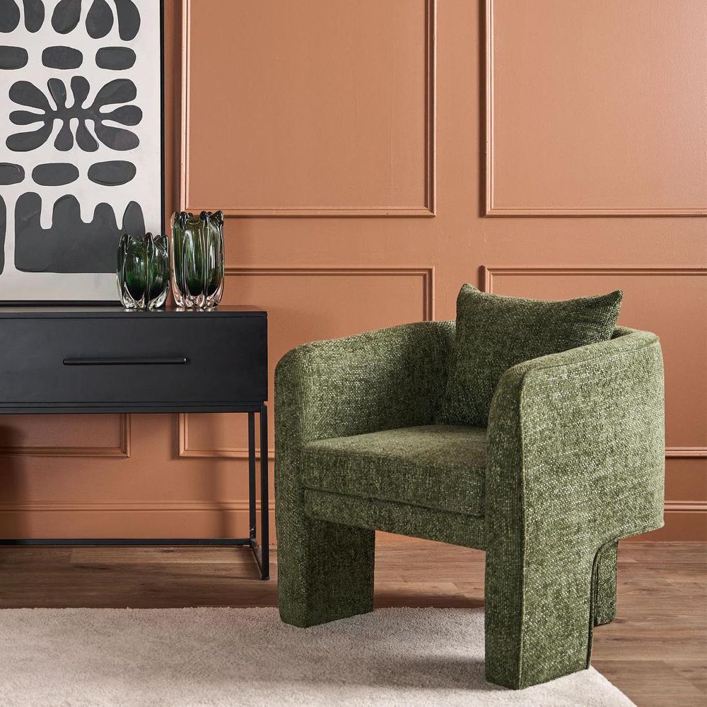 Sit back and let the lush green embrace of our Kennedy Armchair transport you to your own secret garden oasis. Crafted with soft textured fabric and supported by three structural legs, this armchair beckons you to unwind and escape into a realm of relaxation. Whether nestled in your reading nook, placed beside a sunlit window, or adorning your cozy living space, the Kennedy Armchair adds a pop of color and charm to any corner. With no assembly required and maintenance as easy as a quick vacuum and wipe down with a damp cloth, it's the perfect accent piece for your botanical sanctuary. Seat Height = 46cm