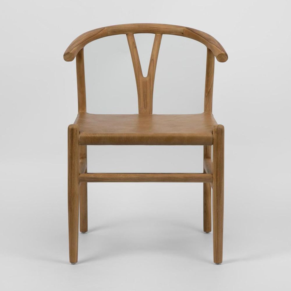 The classic design and timelessness of the Wishbone chair, re-interpreted in this contemporary version, celebrating the solid teak frame, which combines beautifully with the 100% cowhide leather seat, tanned by hand.Subtle variation in finish and tone of the leather are a feature of the design. Available in toffee leather colour. Solid teak frame Weight rated to 150kg