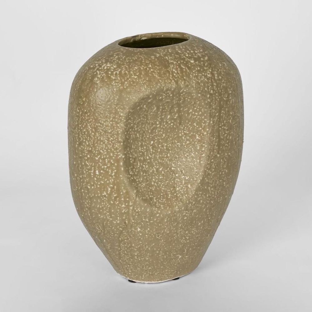 Bold in size and shape these hand-formed terracotta vessels, finished in a tactile and lively glaze in an earthen Olive hue, bring an organic feel to a space. Also available in Speckled white. non-vitrified/porous