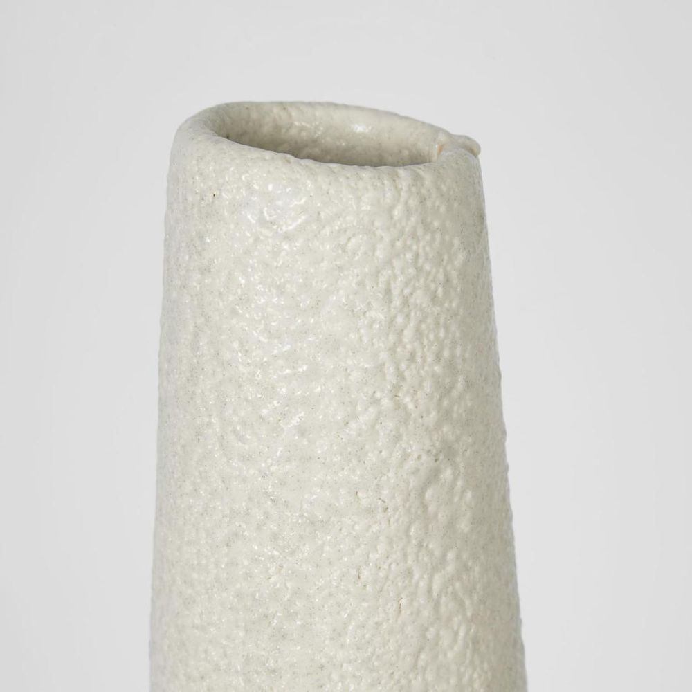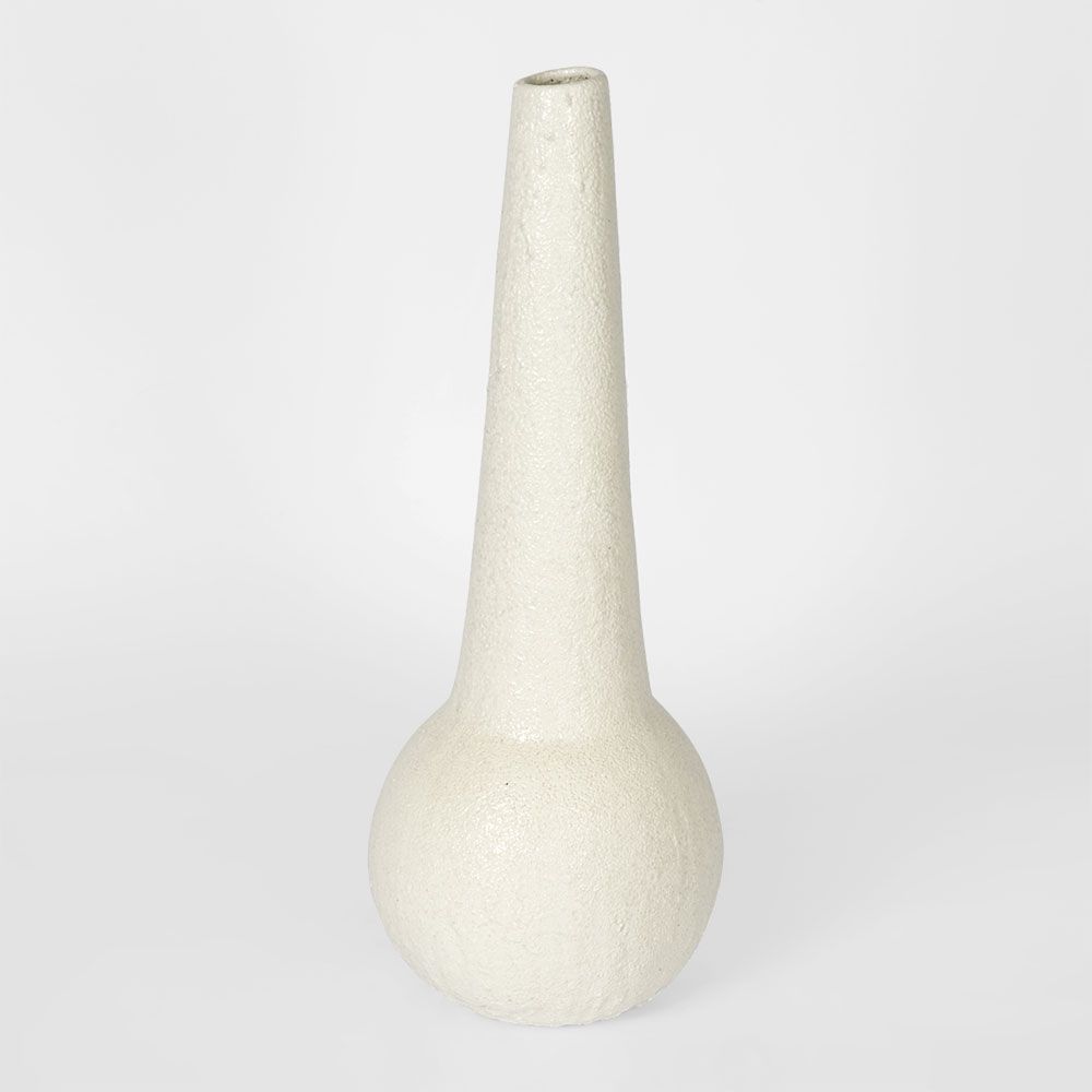 Delicate playful shapes define the Yves range. The slim elongated neck creates a sophisticated vessel for a single stem. Made from hand-thrown and formed terracotta, with textured white glazed finish. non-vitrified/porous