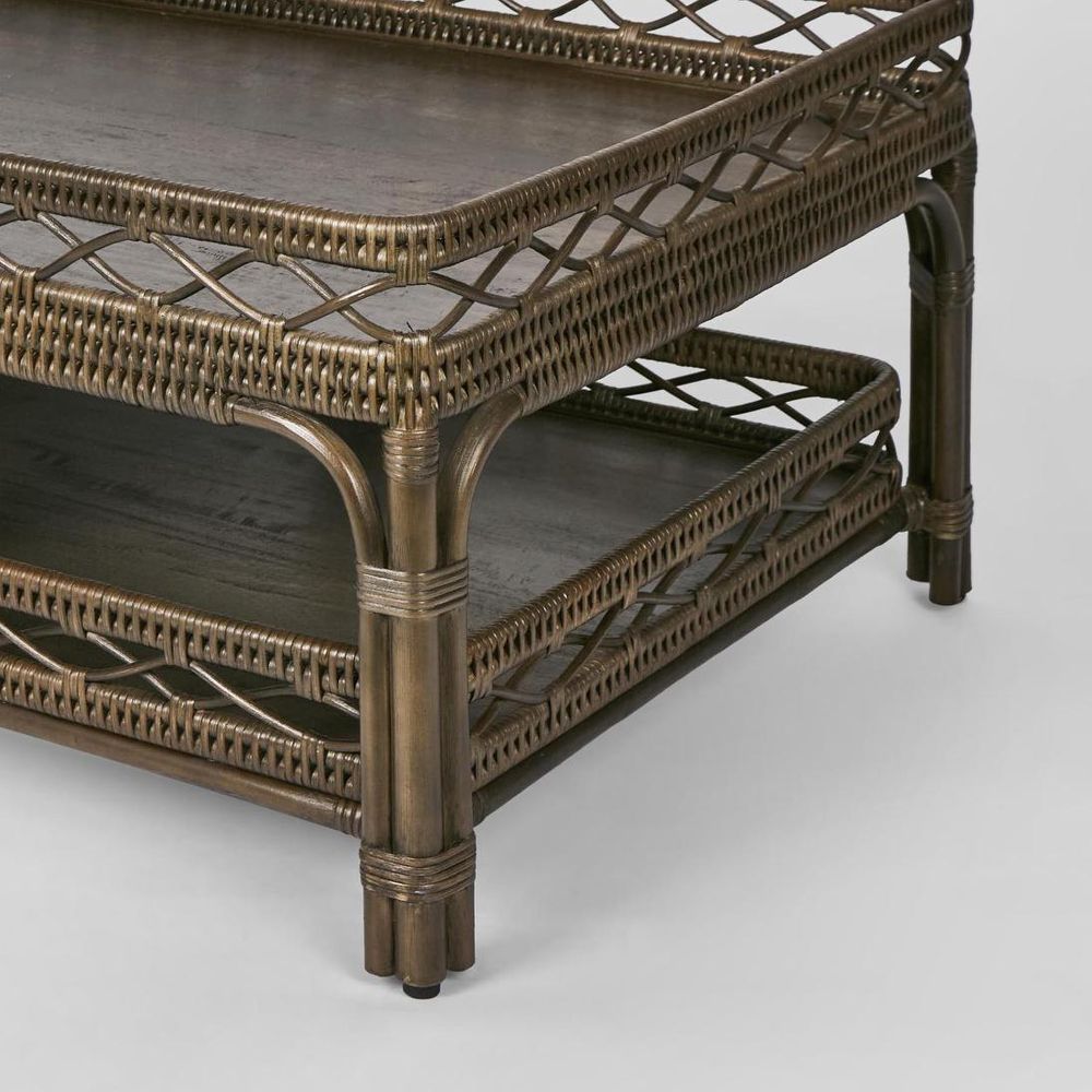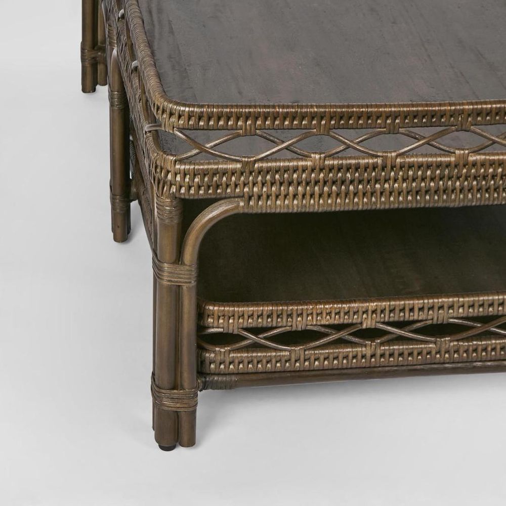The Palm Cove 2 Tier Coffee Table is crafted with meticulous hand-woven rattan, offering a distinctive and durable design. It features a solid mango wood top and shelf, ensuring sturdiness and strength. This combination of materials provides both aesthetic appeal and functionality, making it a robust and stylish addition to any living room space.