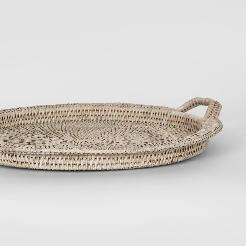 Paume Rattan Round Serving Tray with Handles White wash