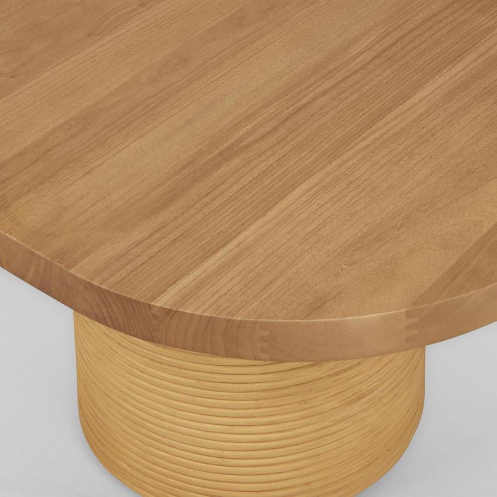 Bold geometry – The Leo coffee table makes a visually striking statement from every angle. 40mm thick solid timber top with waterfall edge to become leg. Rattan encased pillar leg. Constructed from sustainably harvested Solid Sungkai timber, Rattan and plywood. Steel tube reinforcements are threaded through the solid timber and concealed, which provides stability and strength to the timber form. Available in Natural and Ecru finishes.
