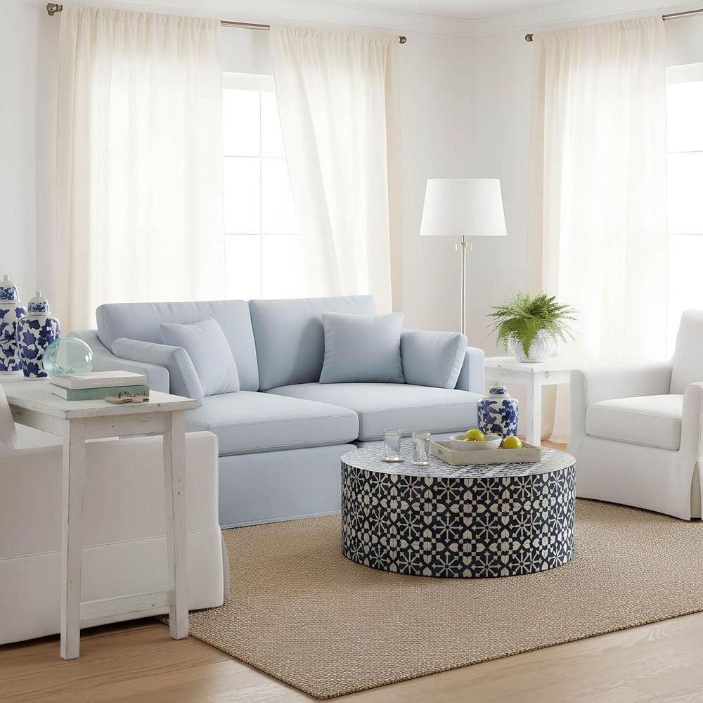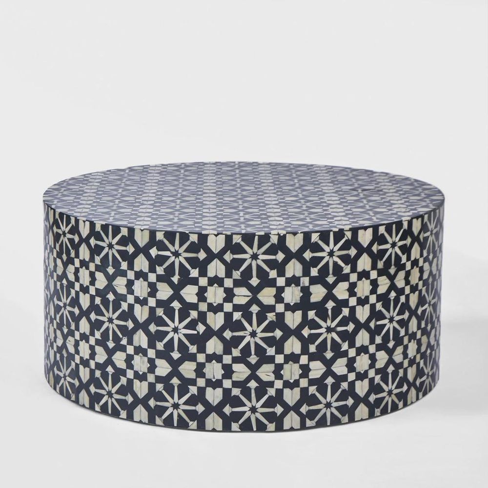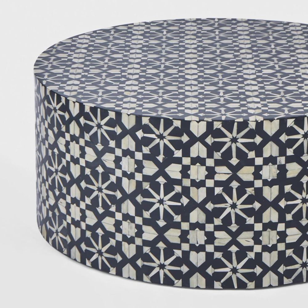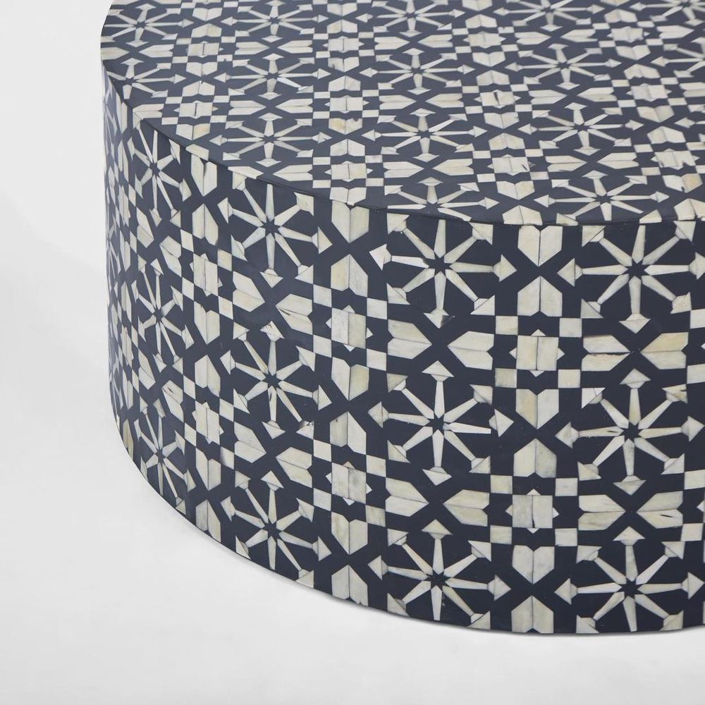 The striking Adina coffee table will make a statement in any interior space.The bold cylindrical form combined with the intrictae bone inlay pattern make it the perfect centre-piece for your interior scheme. Handcrafted from ethically sourced buffalo bones in India, each piece is unique. The time-honoured artisinal craft of Bone Inlay was originally created for the royal palaces of Rajasthan, India. With each piece taking months to complete, intricate fragments of buffalo bones are hand-carved and affixed onto the surface in a mosaic-like design. Resin is then used to fill the space around the bone.