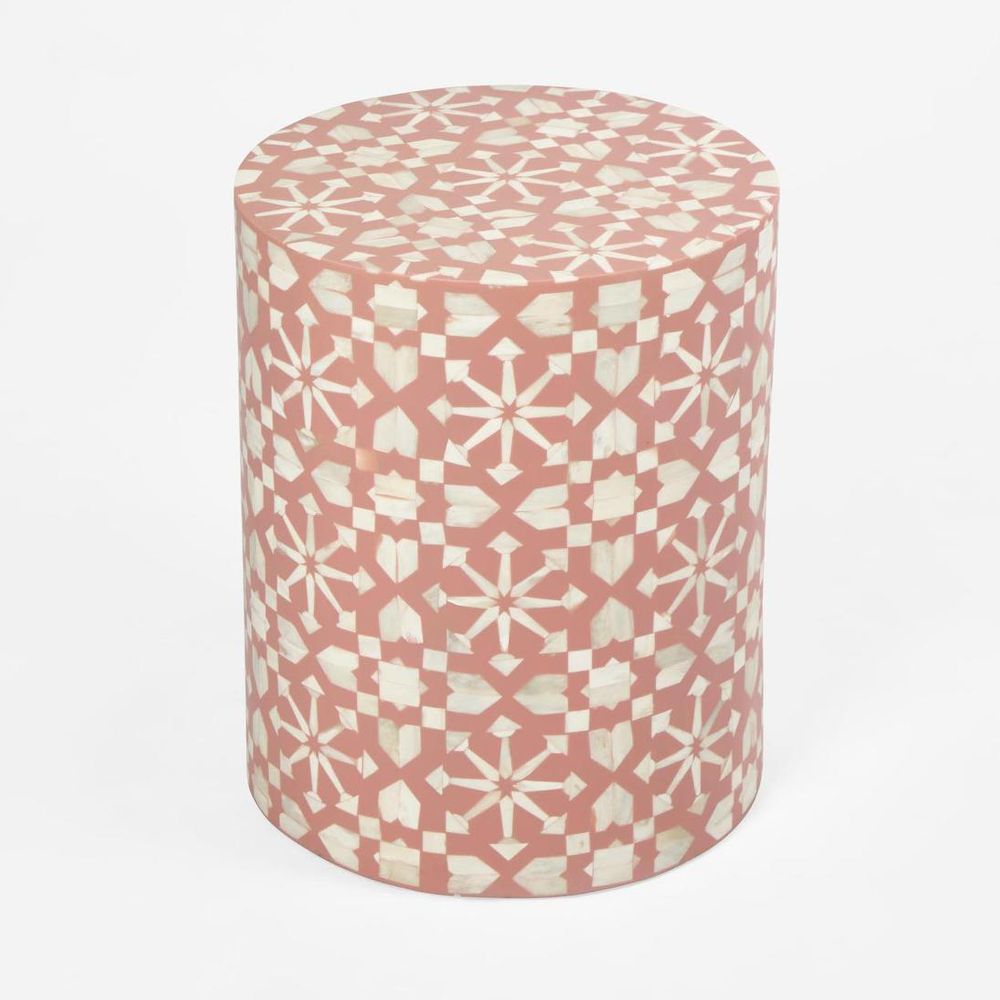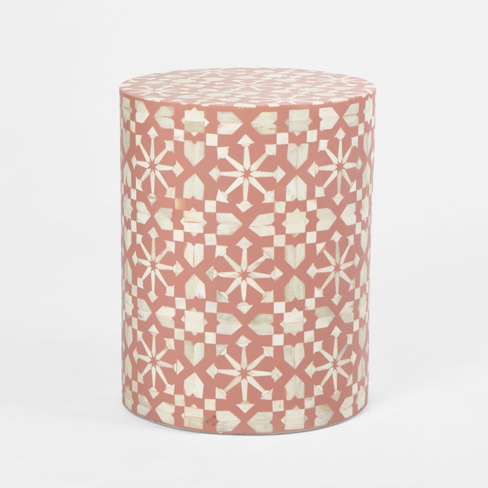 The delightful Adina stools breathe life into your interior space, whether as a side table, or bedside.Available in Aqua/White,Peach/White & Grey/White colourways. Handcrafted from ethically sourced buffalo bones in India, each piece is unique. The time-honoured artisinal craft of Bone Inlay was originally created for the royal palaces of Rajasthan, India. With each piece taking months to complete, intricate fragments of buffalo bones are hand-carved and affixed onto the surface in a mosaic-like design. Resin is then used to fill the space around the bone.
