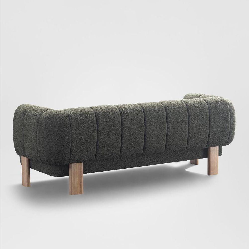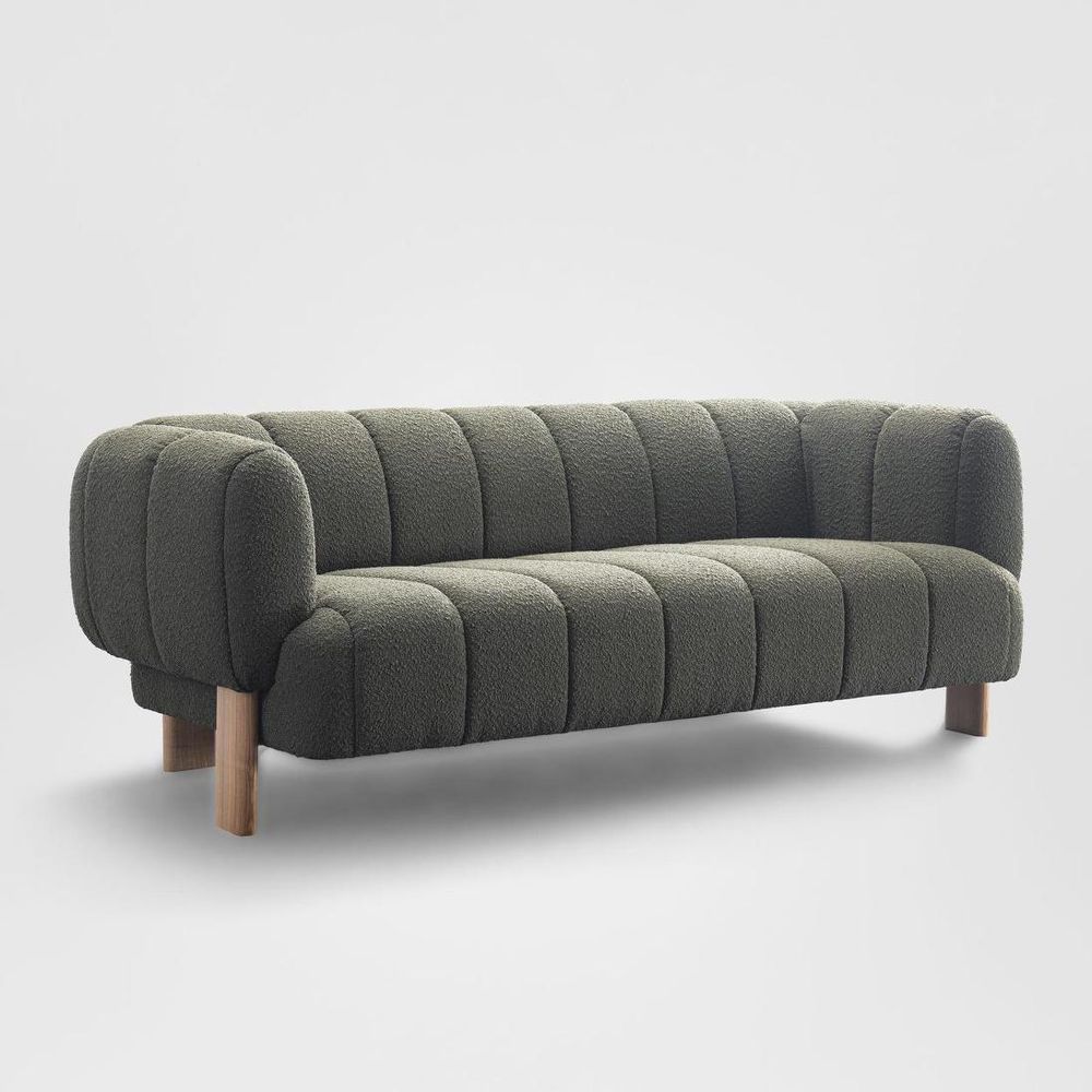 The Ditto Sofa stands confidently on it's statementsolid oak legs.Channeled seams addrhythmic detail to it the curvy form.Finished in a striking Olive Boucle cover.High-density foam raked seating and push back and arm support make the Ditto as comfortable as it is striking.Armchair also available.