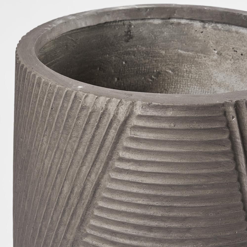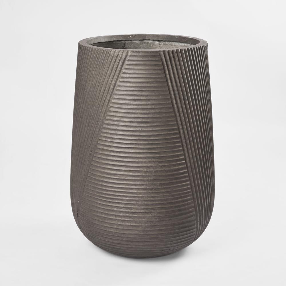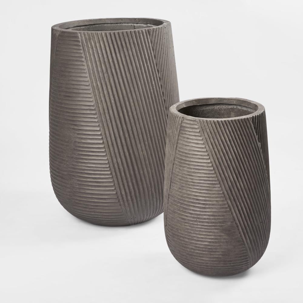 A beautifully ridged pair of planters with vertical texture that adds subtle sculptural interest. The soft taupe finish gives them a classic, grounded feel, while their form is clean enough to blend into both modern and traditional settings. Use them together for symmetry or place them apart to unify styling across a space.0