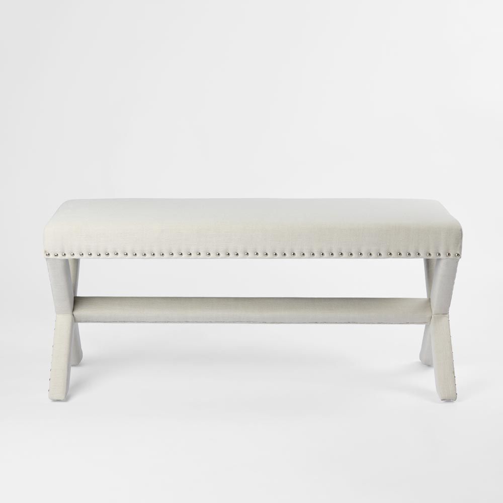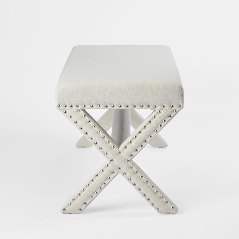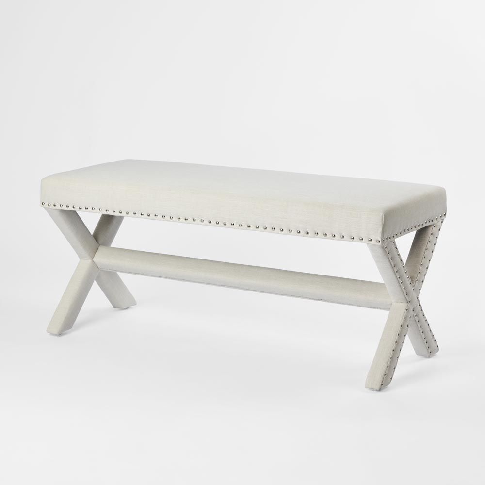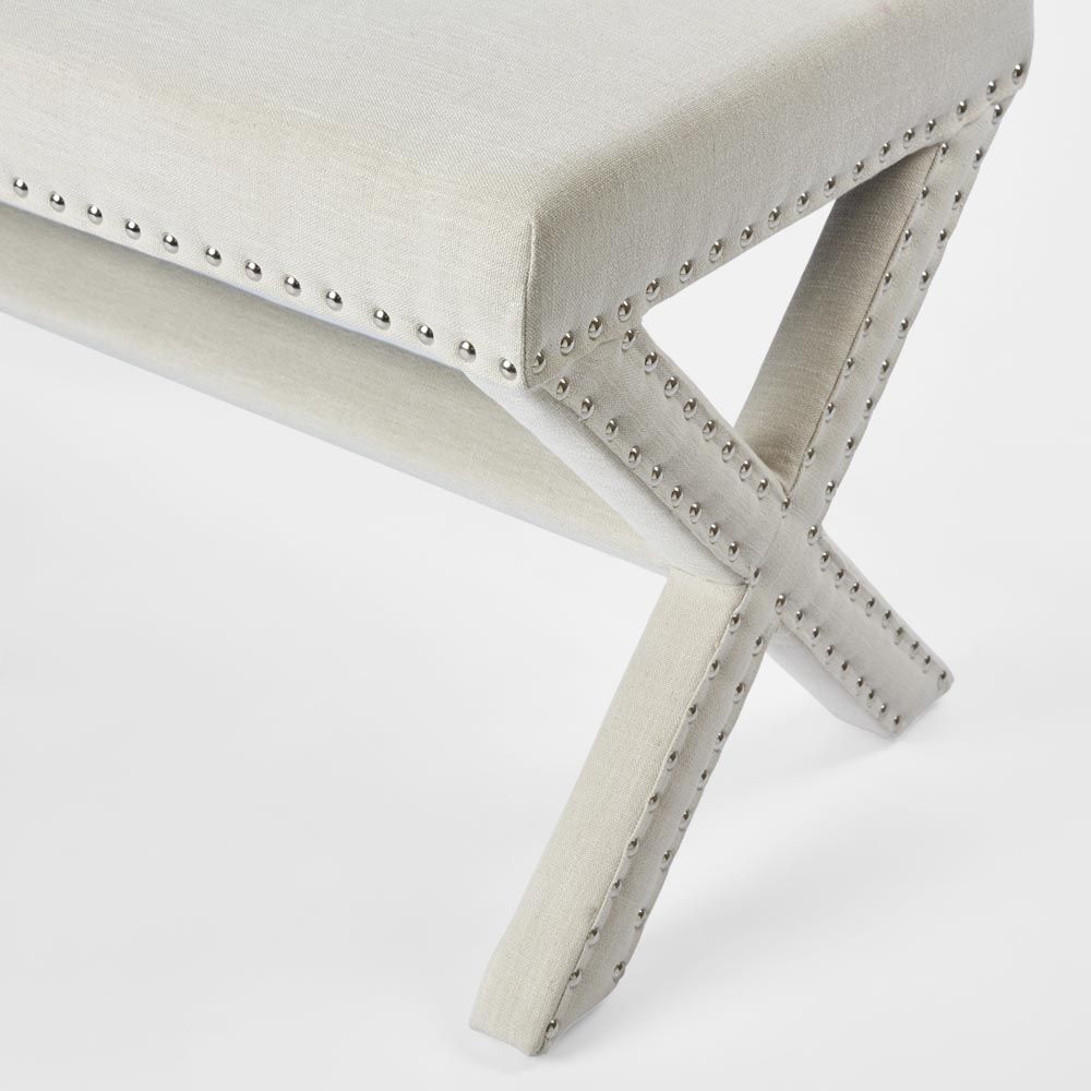 Add a touch of extraordinary flair to your interior design with our Lennox Bench in Natural. Essential for perfecting your space, this designer bench is positively fabulous in your living room or at the foot of the bed. Its visually appealing design features a bench seat sitting atop elegantly X-shaped legs, while timeless nailhead buttons delicately line the sweeping frame. Upholstered in soft fabric with dense foam padding, the Lennox Bench is not just a seat, it's a cozy and chic addition to your modern lifestyle.