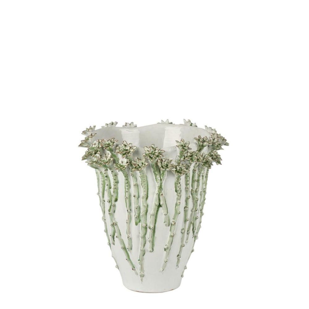 Inspired by corals and sea sponges this Moss Vase is textured and porous. Rough and raw this vase can we used as focal point for any room or fill with your favourite florals or trailing greenery for a dramatic centre piece. Finished in a variegating green to add depth and warmth. Wipe clean with a soft damp cloth. Indoor decorative use only. Not guaranteed 1% watertight. Due to the handmade nature of this design there may be slight imperfections or irregularities and each may differ from the photographed sample. watertight/waterproof