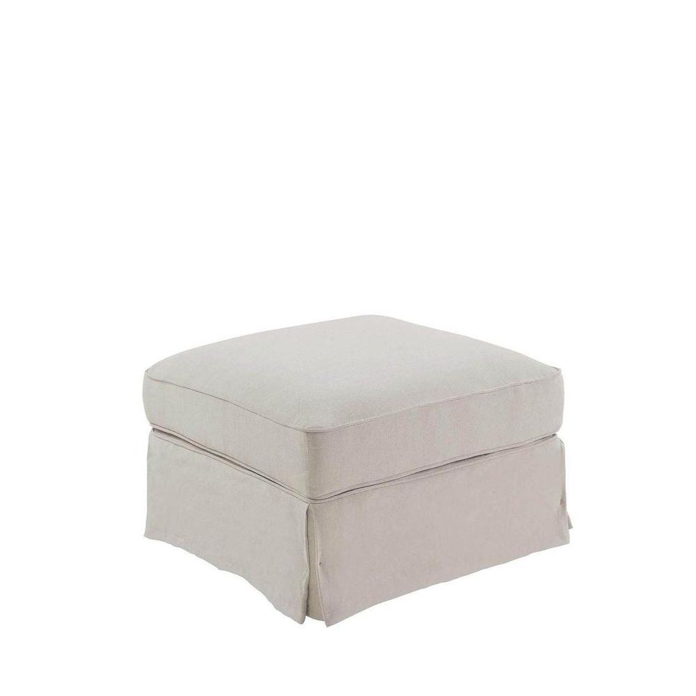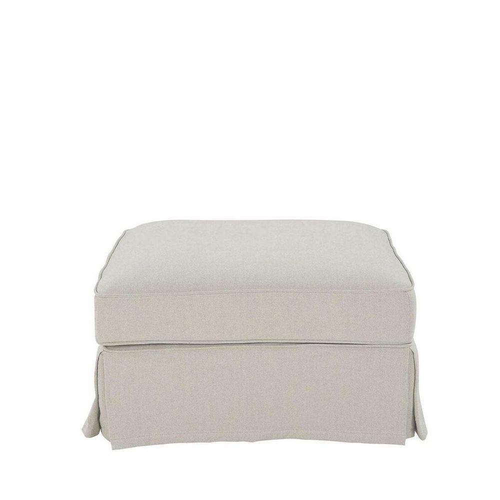 Dimensions: W83cm D83cm H45cm Weight: 25kg Colour: Beige Materials: Timber/Fabric/Foam Frame/Leg Materials: Timber Frame/Leg Material Details: Pine Seat/Padding Materials: Foam/Fabric Seat/Padding Material Details: High Density Foam Fabric Material Details:60% cotton, 40% linen Seating Firmness: Medium Leg Height: 10cm Outdoor: No Assembly: Yes, screw the legs into the ottoman base
