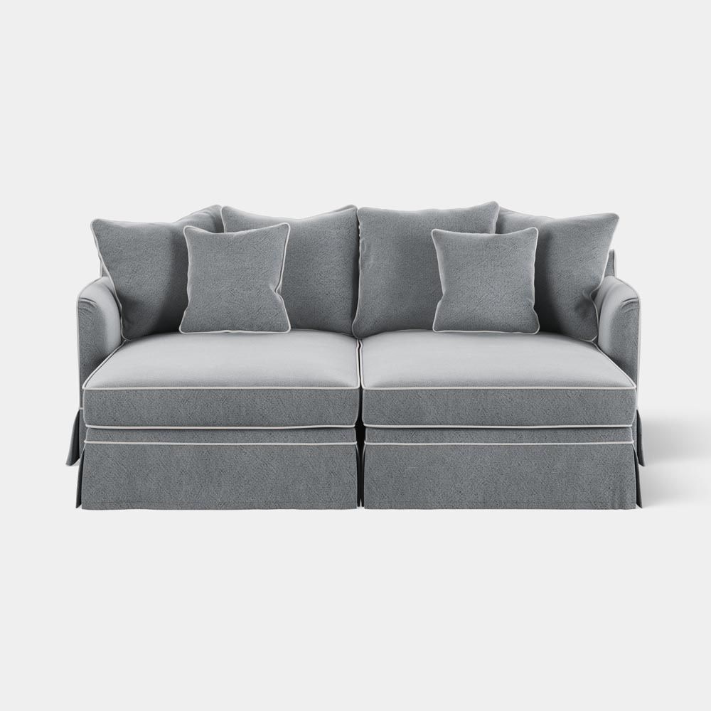 Available in up to 7 classic Hampton’s Fabric covers. Features: Expertly tailored Slip-cover with elegant piping detail embodies the Noosa’s inviting and relaxed form. Fibre-filled loose cushions for extra comfort. Premium high-resilience foam seating with fibre overlay for enduring comfort and support. Sinuous steel springs tethered with high performance latex webbing provide edge to edge seat support. Reinforced solid timber frame engineered to last and backed by our 10yr frame guarantee. Solid hardwood legs - require simple attachment by hand-screwing to base upon delivery. Slip covers and bases are packed separately. Slip covers need to be applied to bases and cushions to complete assembly for use.