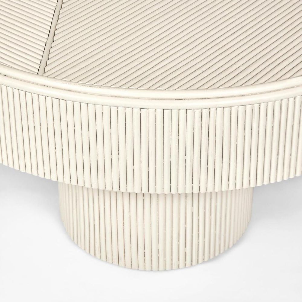 Ecru is the perfect beige, a classy alternative to natural rattan. Designed to complement the Letitia Buffet, this coffee table combines simple cylinder silhouettes with overlay bamboo to create modern geometry. Mix and match with the sia table range. 1300 x 900 x 350 mm H solid bamboo and plywood base with overlay bamboo ecru enamel painted finish