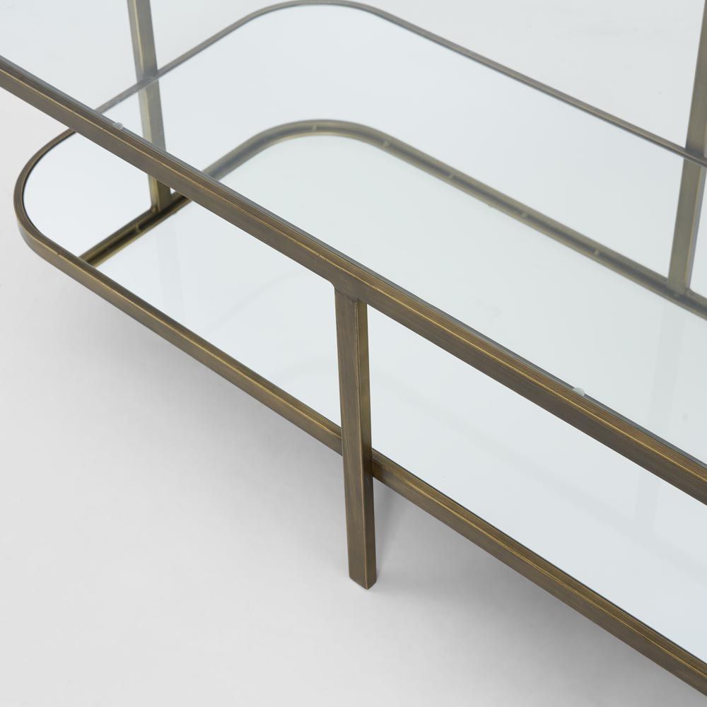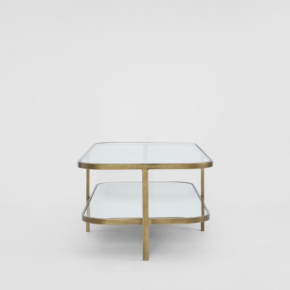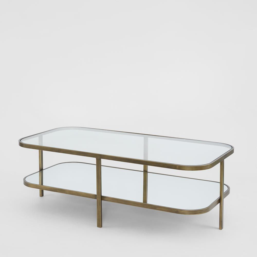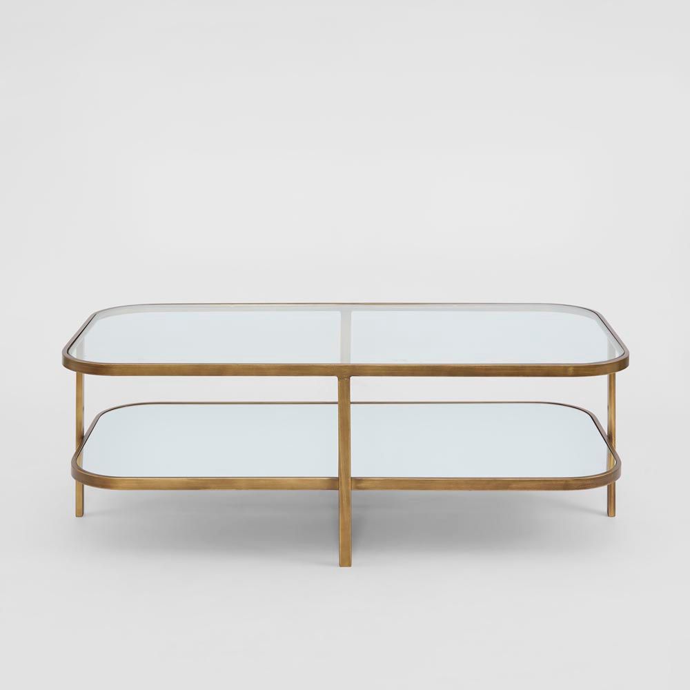 The Lewis Brass Iron Glass & Mirror Coffee Table is a new addition to our ever popular range of brass & glass tables. This stunning long coffee table features a clear glass top with mirorred lower shelf. The glass top acts as a window to showcase showcase your books and décor whilst the mirrored shelf reflects light enhancing the scale & size of any room. Finished in warm brass the curved edges on the iron frame encapsulate the surfaces keeping everything secure. Make this coffee table a statement piece in your lounge room.
