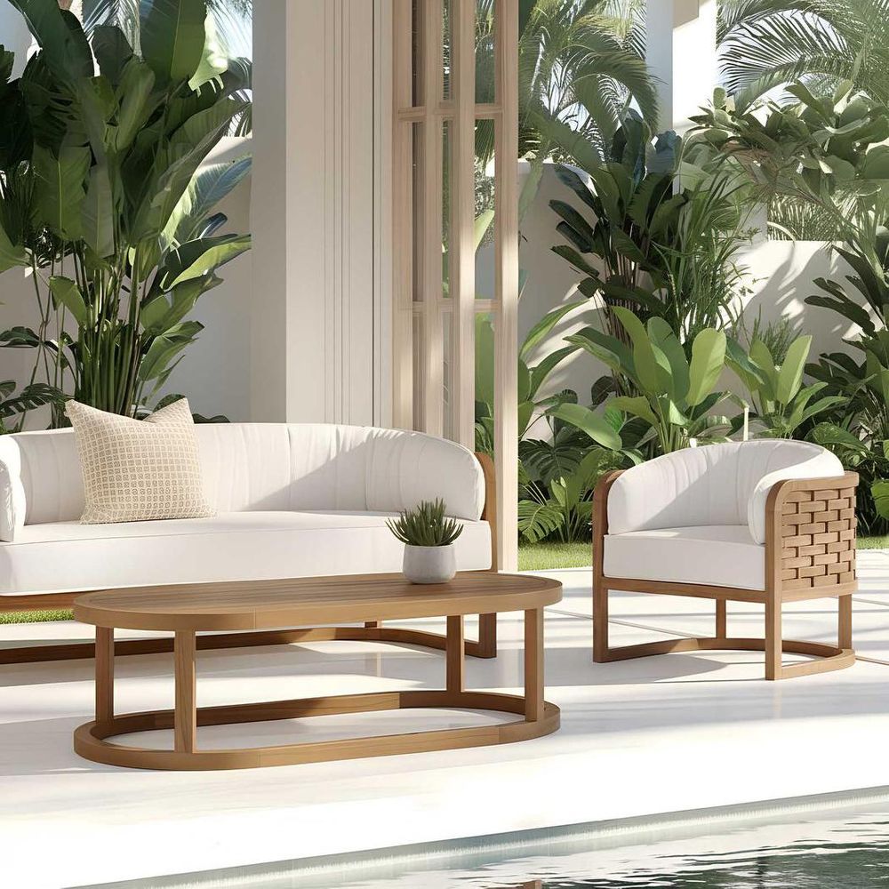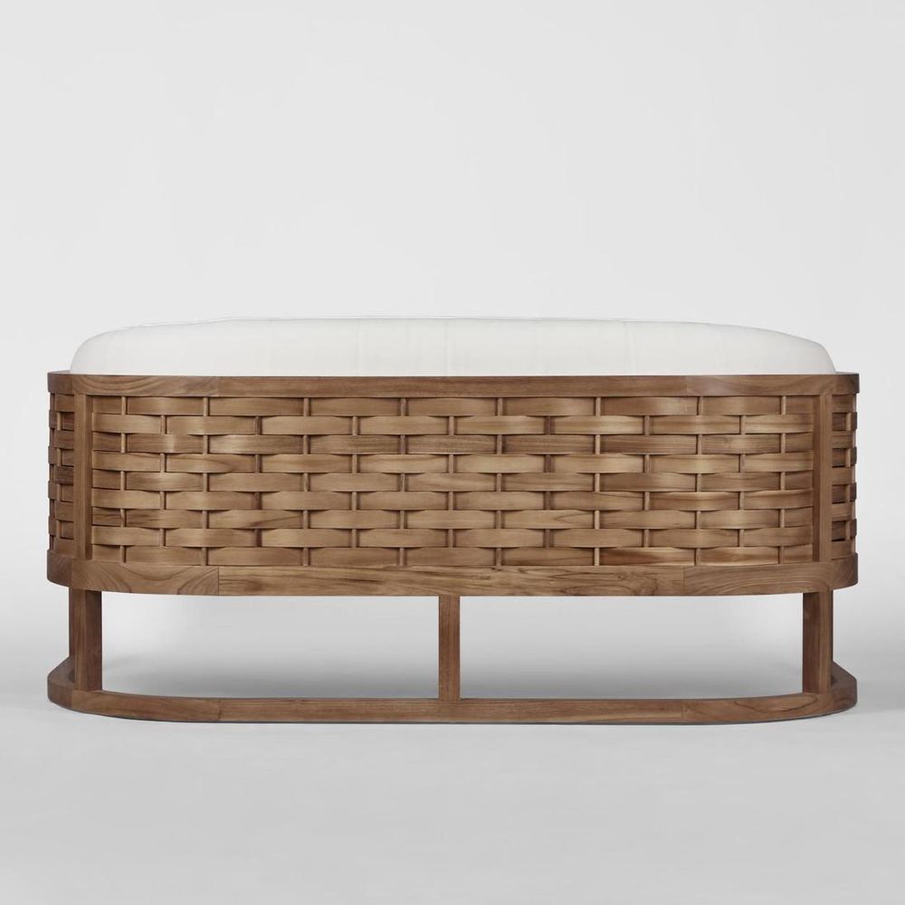 Introducing the Weave Indoor/Outdoor Teak Sofa, a masterpiece of craftsmanship that blends intricate design, premium materials, and versatile functionality. This sofa features handwoven wood detailing, a solid teak wood frame, and 100% outdoor fabric, making it a stylish and durable addition to any space. Key Features: Intricately Woven by Hand: The Weave Sofa showcases a beautiful, handwoven design that adds texture and visual interest. Solid Teak Wood Frame: Constructed from high-quality, solid teak wood, this sofa offers exceptional durability and stability. Teak wood is renowned for its natural resistance to weather and aging, making it an ideal choice for both indoor and outdoor use. 100% Outdoor Fabric: The sofa is upholstered with 100% outdoor fabric, designed to withstand the elements while providing comfort and style. The fabric is resistant to fading, moisture, and mildew, ensuring long-lasting beauty and functionality. Soft Curves: Designed with soft, flowing curves, the Weave Sofa offers a comfortable and inviting seating experience. The hugging cushion design supports relaxed seating, making it perfect for lounging and socializing. Versatile Use: Suitable for both indoor and outdoor settings, this sofa is perfect for patios, gardens, living rooms, and sunrooms. Its versatile design allows it to seamlessly transition between different environments, enhancing the aesthetic of any space. Durable Construction: The combination of handwoven craftsmanship, solid teak wood, and outdoor fabric ensures that this sofa is built to last. Its robust construction guarantees long-term use and enjoyment. Easy Maintenance: The Weave Sofa is designed for easy maintenance. The teak wood frame can be cleaned with mild soap and water, while the outdoor fabric can be spot-cleaned to keep it looking fresh and new. Eco-Friendly Material: Teak wood is a sustainable choice, as it is harvested from responsibly managed plantations. By choosing the Weave Sofa, you are supporting eco-friendly practices and sustainable forestry. Elevate your indoor or outdoor space with the Weave Indoor/Outdoor Teak Sofa, where intricate handwoven design meets durable craftsmanship. Enjoy a piece that combines beauty, comfort, and versatility, making it a perfect addition to any home. Cushions should not be left outside for extended periods or in the rain.Furniture left on damp ground or in pooled water will reduce the life of the frame.